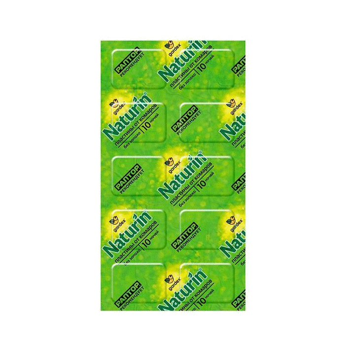 Универсальные пластины GARDEX Naturin — это надёжное средство от комаров. Комплект из 10 штук, каждая из которых рассчитана на 8 часов непрерывного действия. Подходит для использования как в закрытых помещениях, так и в хорошо проветриваемых.Способ применения:Вскрыть упаковку, извлечь пластину. Поместить пластину в фумигатор, в прорезь с нагревательным элементом, таким образом, что бы она располагалась горизонтально. Прибор включить в сеть 220В.