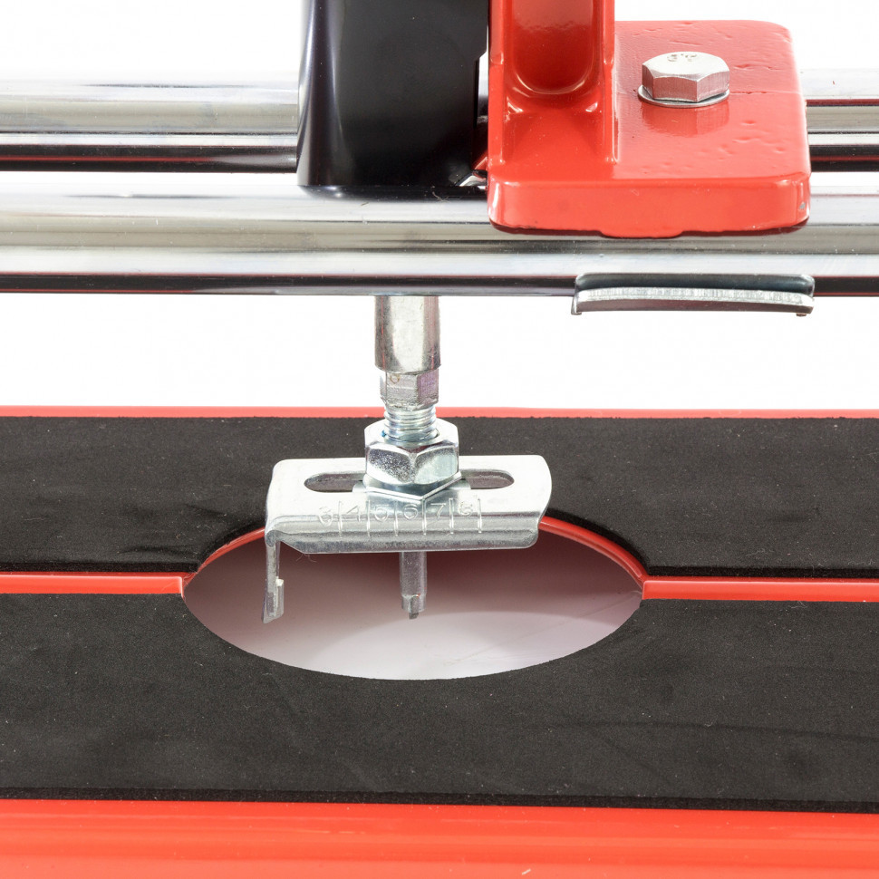 • Неподвижность плитки — плиткорез с широким основанием снабжен мягкими амортизирующими накладками, угольник-угломер дополнительно фиксирует заготовку.