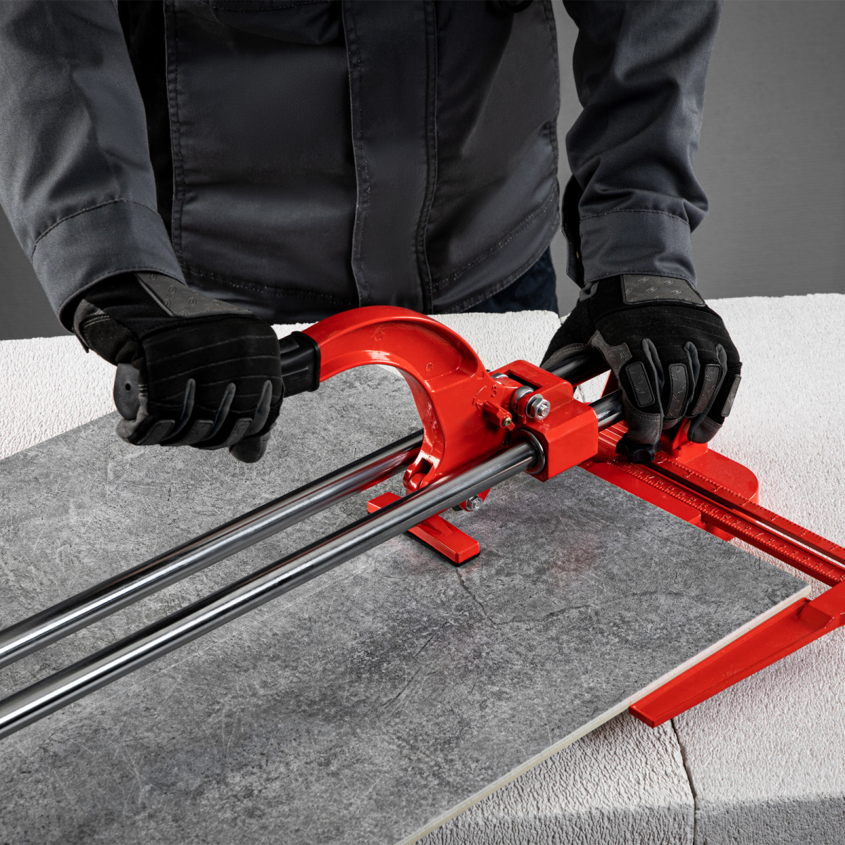 - Плавный и свободный ход — цельнолитая закрытая каретка снабжена шарикоподшипниковым механизмом, две трубчатых направляющих из хромированной стали с антикоррозионным покрытием обеспечивают свободный ход каретки по ним в процессе резки.