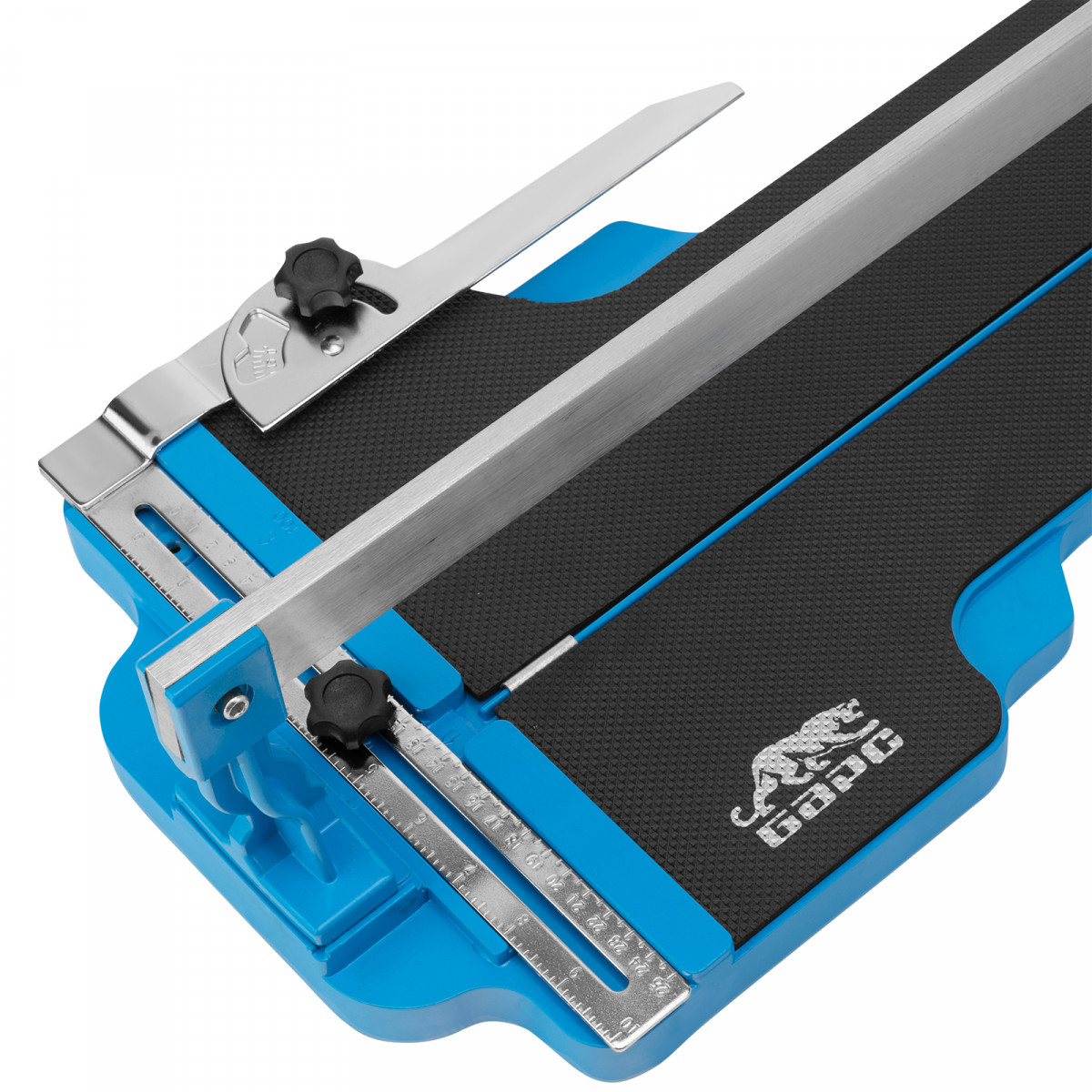 • Резка плитки под углом до 60° — производитель предусмотрел металлическую линейку с угломером.