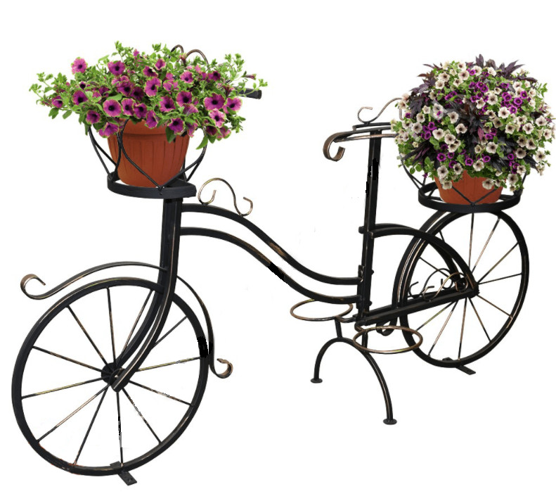 Кованый велосипед для цветов очень любим дизайнерами и часто используется для декора сада или парка. Используйте это модное изделие, чтобы создать в саду особый неповторимый стиль и придать участку ухоженность и атмосферу уюта. Подставка для цветов выполнена в форме велосипеда и предназначена для установки четырех цветочных горшков. Изготовлена из прочного металла и окрашена в черный с золотом цвет.