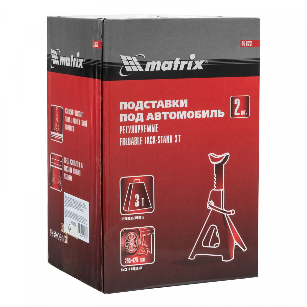 Регулируемые подставки под автомобиль Matrix 51623 с несущей способностью 3 т, 2 шт. в комплекте, удерживают груз на высоте 295-425 мм. Их используют в качестве средства дополнительной фиксации и страховки легкового автомобиля, поднятого на подъемнике или домкрате. Конструкцией предусмотрен зубчатый механизм, надежно удерживающий шток в выдвинутом положении. Подставки пригодятся в гараже или автосервисе во время проведения ремонтных работ.