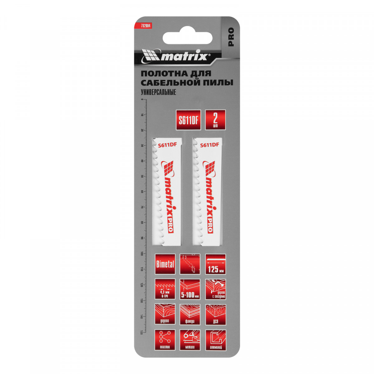 Универсальные полотна для сабельной пилы S611DF Matrix PRO 782004 с шагом зубьев 4,3 мм, биметаллические (Bimetal), 2 шт. в упаковке, имеют рабочую длину 125 мм и позволяют быстро и качественно распиливать заготовки из древесины, пластика, листового металла, фанеры, ДСП, справляются также с алюминиевыми профилями и древесиной с гвоздями. В зависимости от материала глубина распила составляет от 5 до 100 мм. Полотна пригодятся на строительной площадке, во время ремонта, демонтажа различных конструкций, будут полезны дома и на даче.