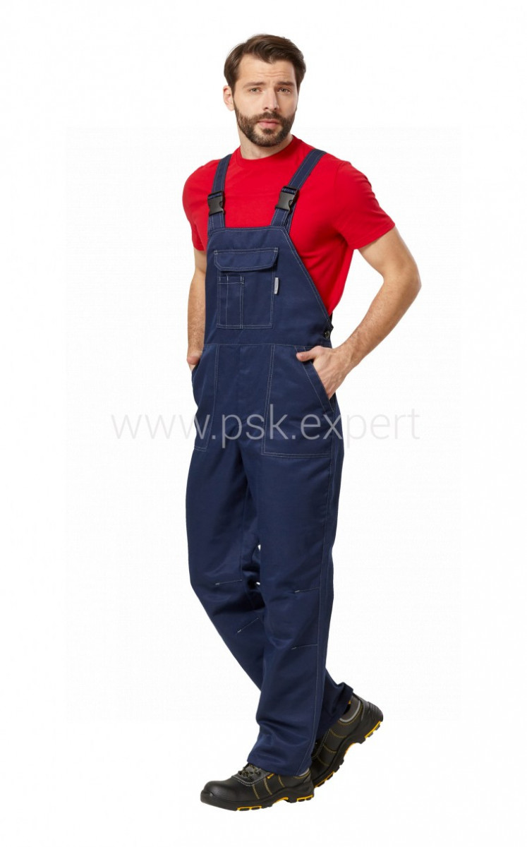 Полукомбинезон с притачной грудкой на бретелях с эластичной тесьмой, застегивающимися на фастекс, гульфик на молнии и боковая застежки на пуговицы. Нагрудный карман с клапаном, два боковых кармана, на задней части брюк дополнительный карман для инструмента со шлевкой-держателем. Вытачки в области колен, создающие дополнительный объем, для более комфортной работы. Все детали отстрочены контрастной отделочной строчкой.