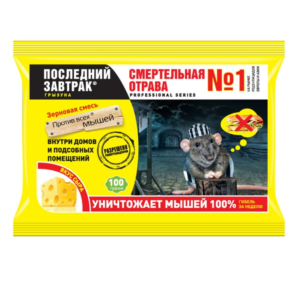 Серия "Последний завтрак" . ДВ - бромадиолон.готовая к применению родентицидная приманка представляет собой массу из смеси различных зерен (овес, пшеница, ячмень и др.), окрашенную в красный или иной яркий цвет (в зависимости от окраски концентрата действующего начала).