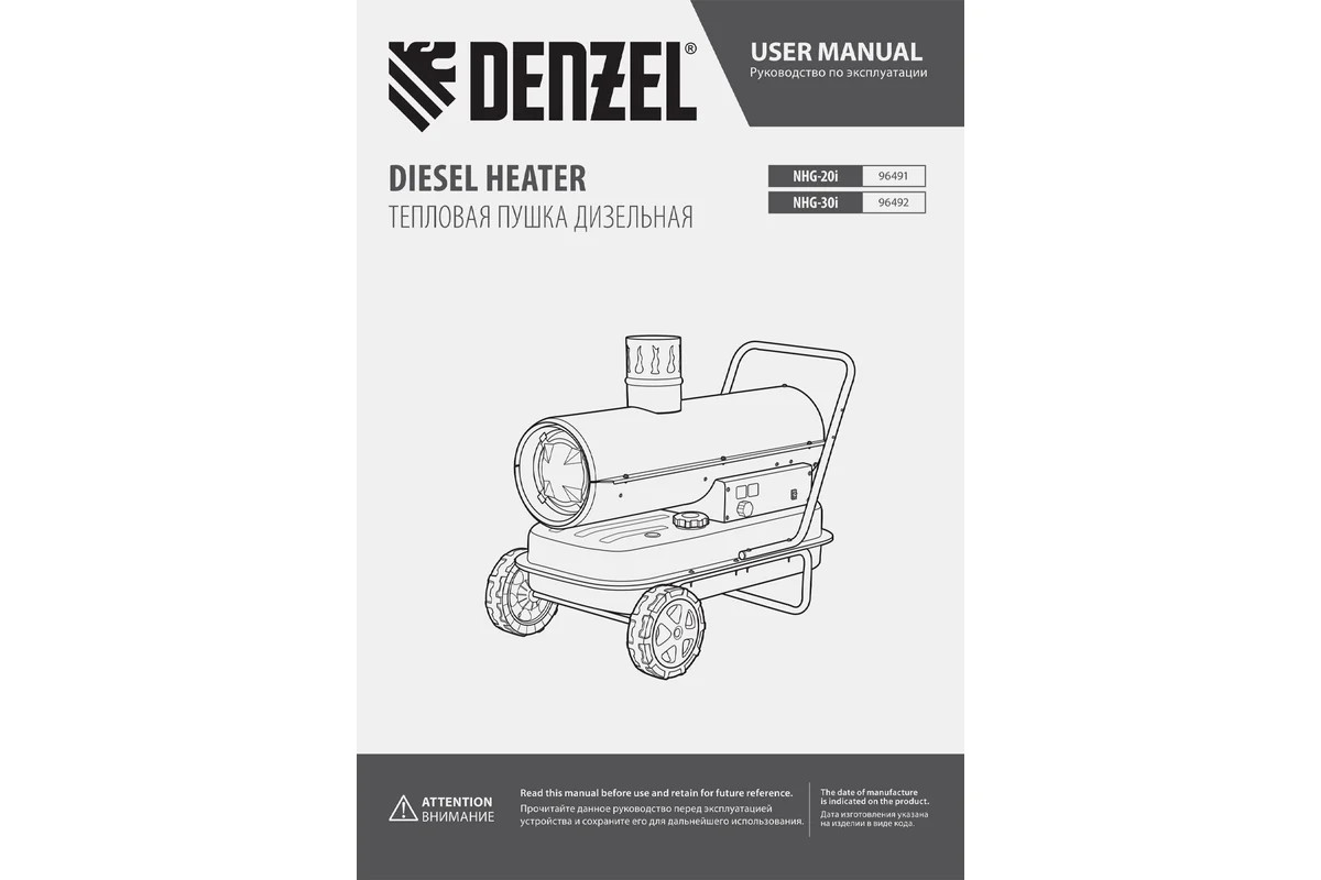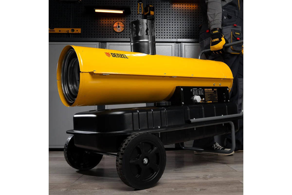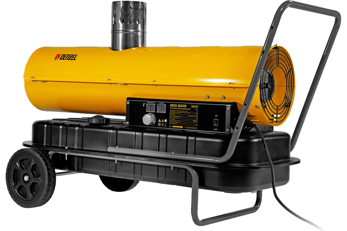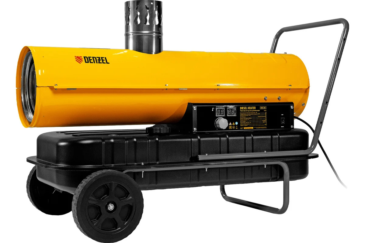 Дизельная тепловая пушка непрямого нагрева DENZEL NHG-30i 96492 с цифровым термостатом обладает тепловой мощностью 30 кВт и генерирует поток теплого воздуха 750 м3/ч.