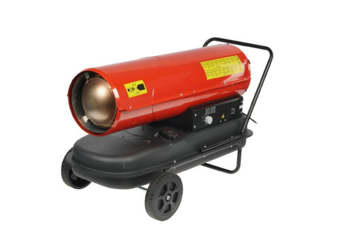 Корпус модели выполнен из антикоррозийного материала и обладает повышенной теплоизоляцией. Благодаря термостату вы можете регулировать степень нагрева и нужную температуру. Тепловую пушку легко перемещать по помещению при помощи колес.