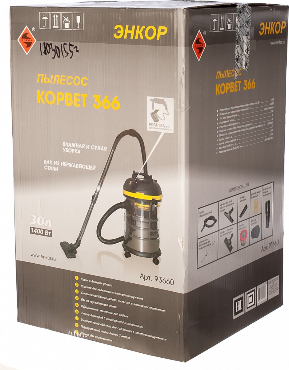 Этому способствует наличие мощного привода, крупного бака для сбора отходов, а также прочного корпуса, устойчивого ко всем видам внешних негативных воздействий. Пылесос является очень удобным в управлении за счет продуманной конструкции и наличия ряда приспособлений, облегчающих его работу. Конструктивные особенности Энкор Корвет-366:
