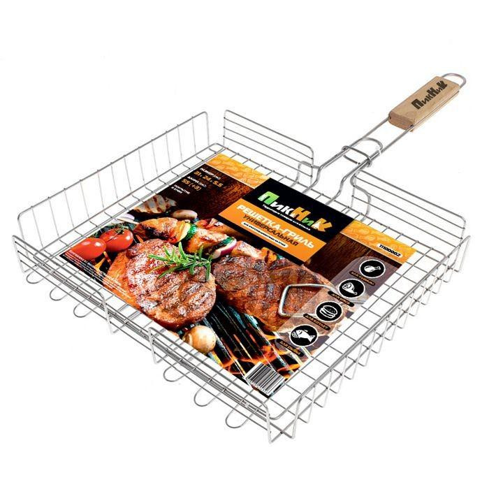 Решетка-гриль-это незаменимый помощник для отдыха на природе!Длина 69 см+3 см "усики".Размер решетки 41х34х5,5 см.Диаметр проволоки: ручки - 4,8 мм, решетка - 1,8 мм, края основания - 2,5 мм.