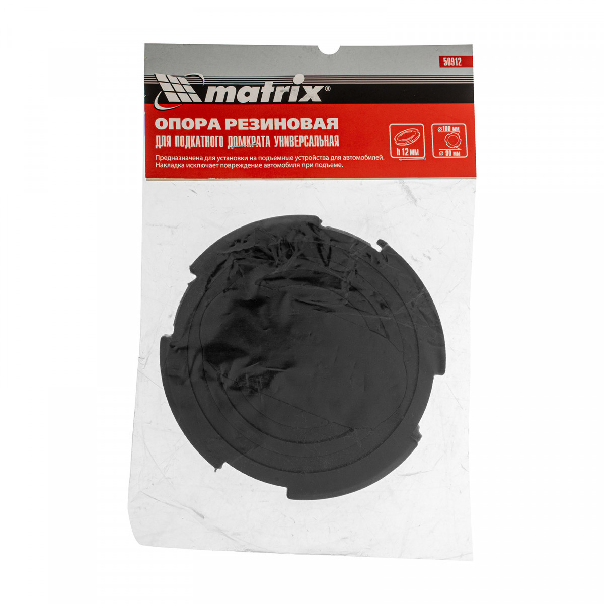 Универсальная резиновая опора Matrix 50912 диаметром 100/90 мм и толщиной 12 мм пригодится при использовании подкатного домкрата. Она надежно защищает корпус автомобиля и верхнюю опору подъемного устройства от механических повреждений. Рассчитана на эксплуатацию с моделями 51133, 51136, 51137.