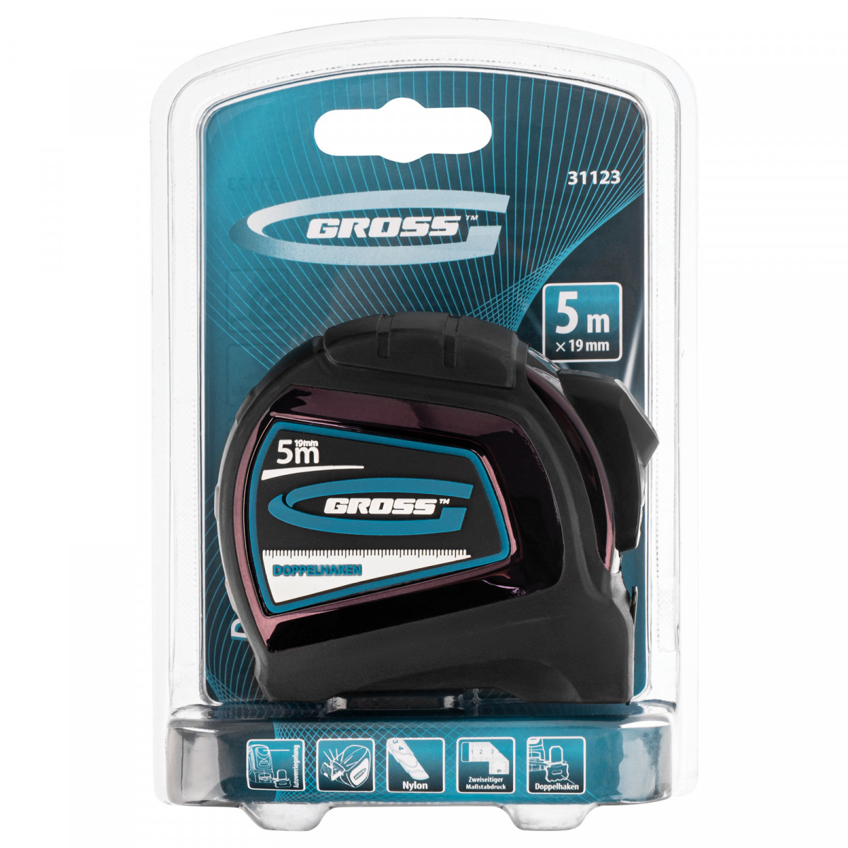 Рулетка "Doppelhaken",5 м x 19 мм,двухсторонний зацеп,Нейлон,двусторонняя шкала,автоматическая фиксация Gross