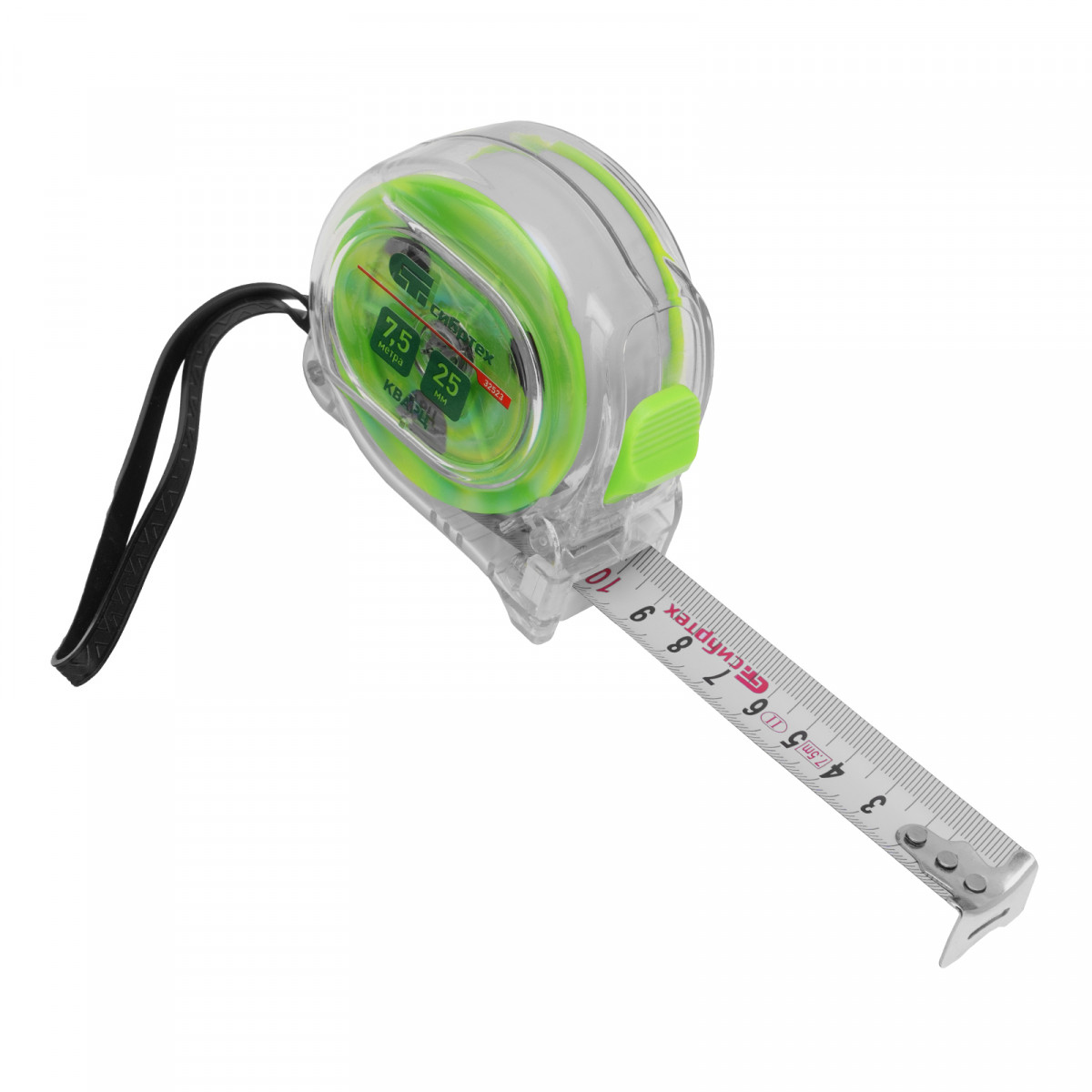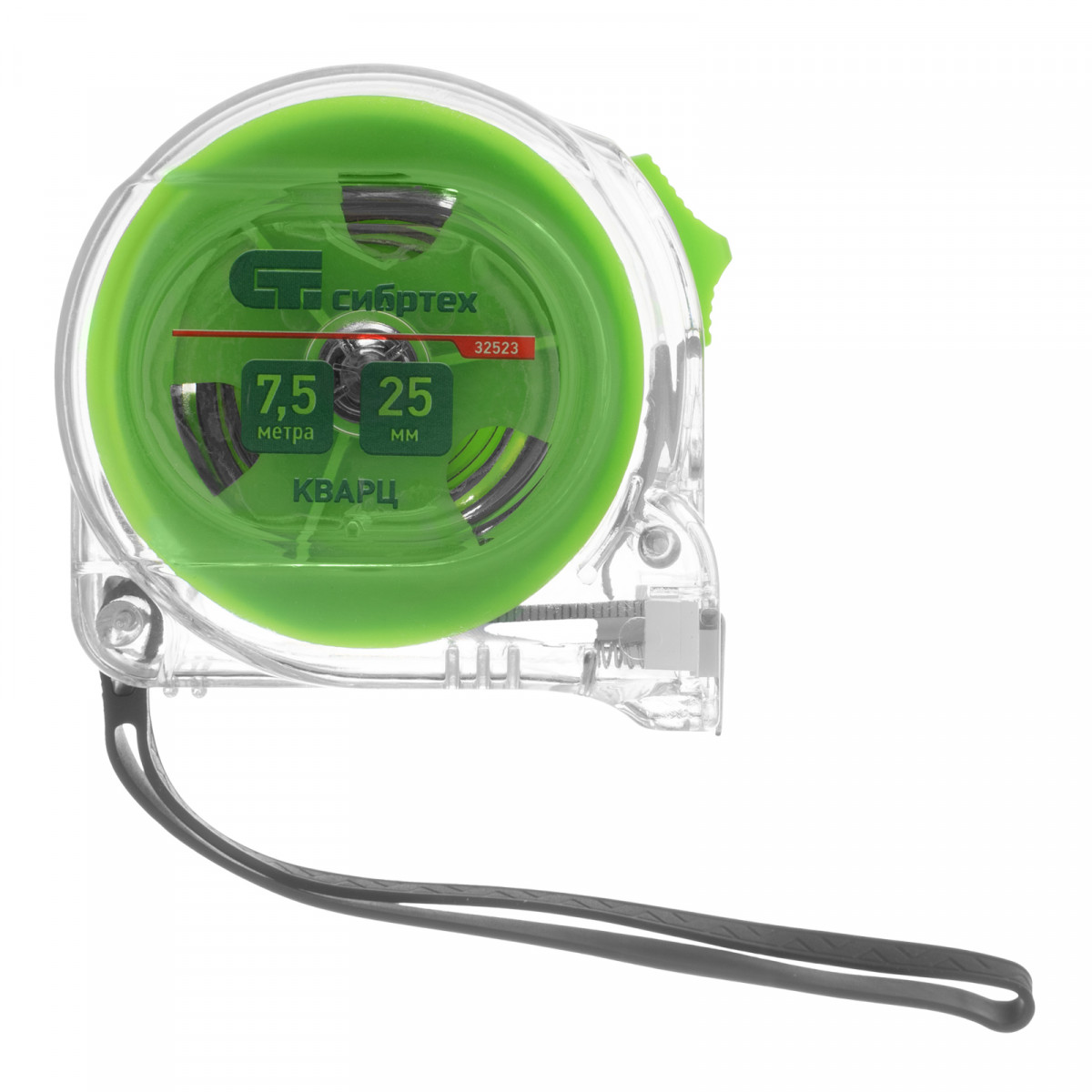 Рулетка Кварц,прозрачный корпус,амортизатор,7,5 м х 25 мм Сибртех