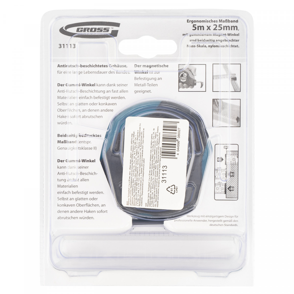 Рулетка Gross «Schlagfest» 31113 с магнитным обрезиненным зацепом, двухсторонней шкалой и функцией автоматической фиксации полотна, 5 м х 25 мм, позволяет определять размеры материалов, вычислять площадь помещения и проводить другие измерительные работы Карманная рулетка — незаменимый инструмент в хозяйстве и на строительной площадке. Магнитный обрезиненный зацеп обеспечивает возможность захвата скользких и металлических поверхностей со сложной формой.