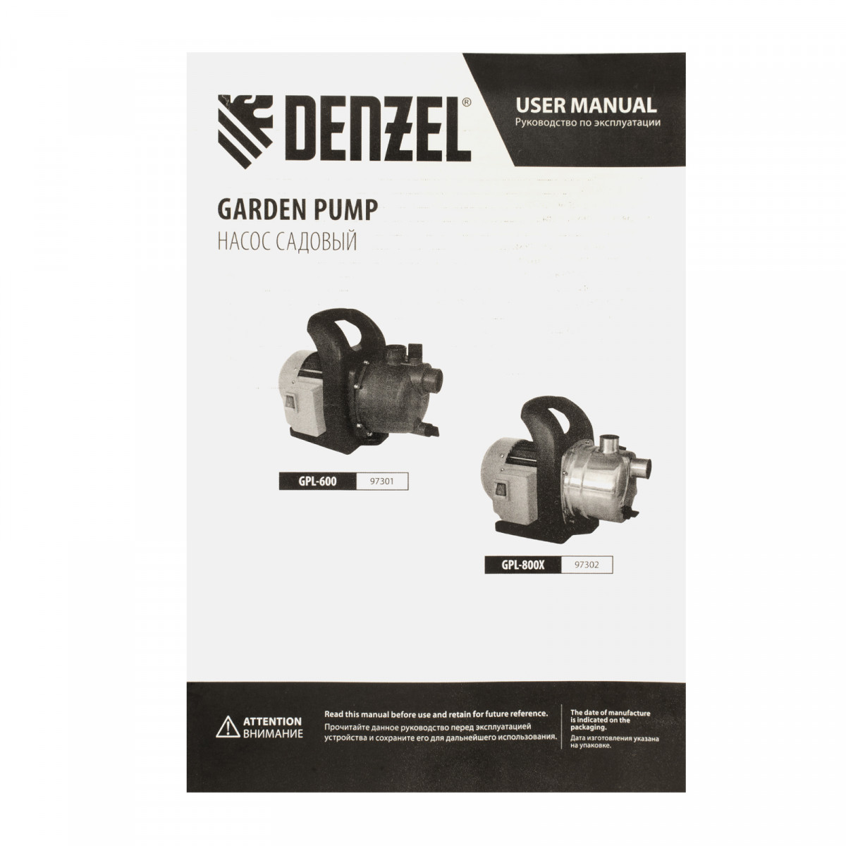 Садовый поверхностный насос GPL800Х, 800 Вт, 3200 л/ч, подъем 42 м, нержавейка Denzel
