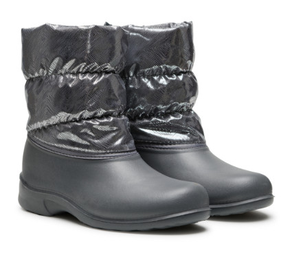 Укороченные лёгкие женские зимние сноубутсы из морозостойкого полимера, утепленные дублированным нетканным ворсовым полотном для большего комфорта. Верх из декорированной фольгой ткани с водоотталкивающей пропиткой дублирован поролоном практичен в уходе. Объем верхней части сапога достаточен для комфортного обувания.