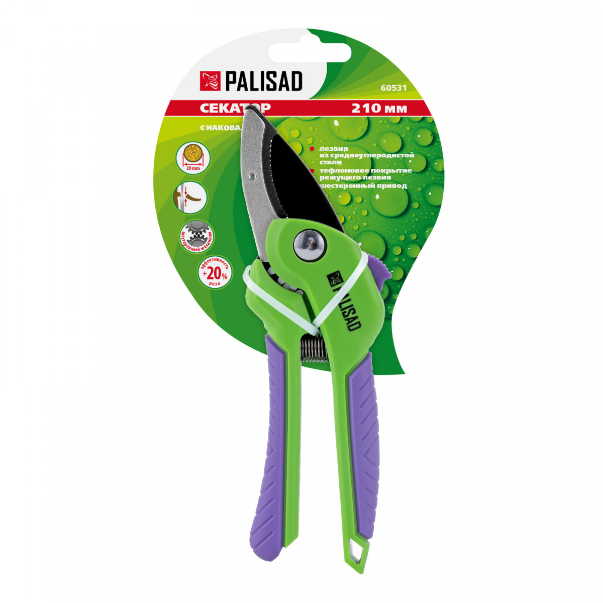 Секатор с наковальней, 210 мм, шестеренный привод, двухкомпонентные рукоятки, Palisad