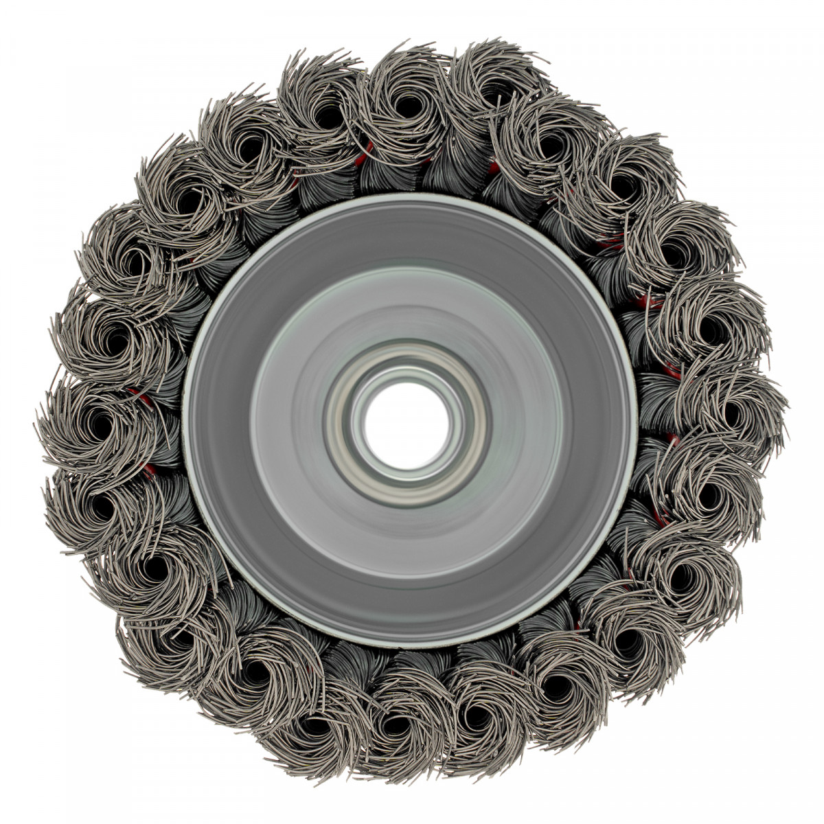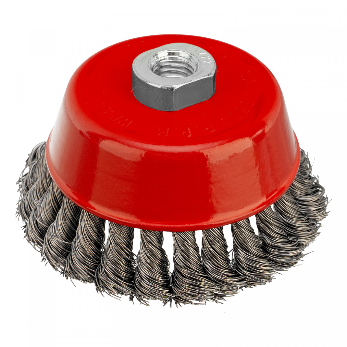 Щетка Matrix «Чашка» 74615 диаметром 100 мм, с присоединительной резьбой М14, с щетиной из крученой проволоки диаметром 0,35 мм, устанавливается на УШМ, поддерживающую работу со скоростью 8500 об/мин. Щетина предназначена для грубой (черновой) обработки поверхностей, менее агрессивной по сравнению с щетиной 0,5 мм. Изделие подходит для удаления загрязнений, снятия толстого слоя ржавчины, ЛКМ, зачистки сварных швов.