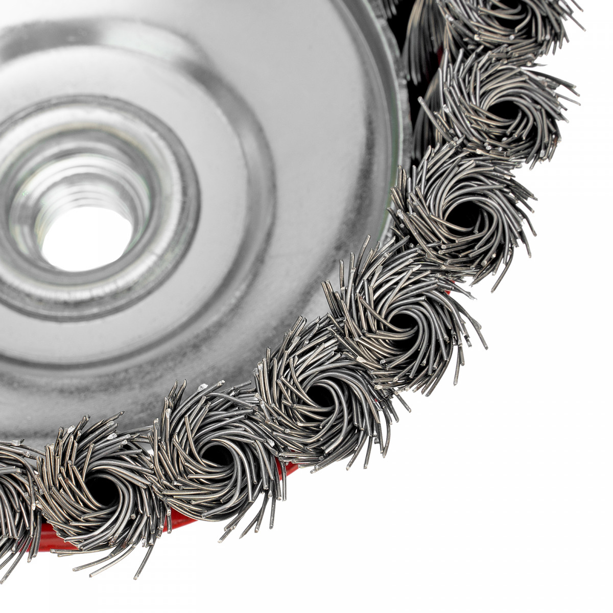 Щетка Matrix «Чашка» 74627 диаметром 125 мм, с присоединительной резьбой М14, с щетиной из крученой проволоки диаметром 0,5 мм, устанавливается на УШМ, поддерживающую работу со скоростью 6500 об/мин. Изделие предназначено для грубой (черновой) обработки поверхностей и подходит для удаления загрязнений, снятия толстого слоя ржавчины, ЛКМ, зачистки сварных швов.