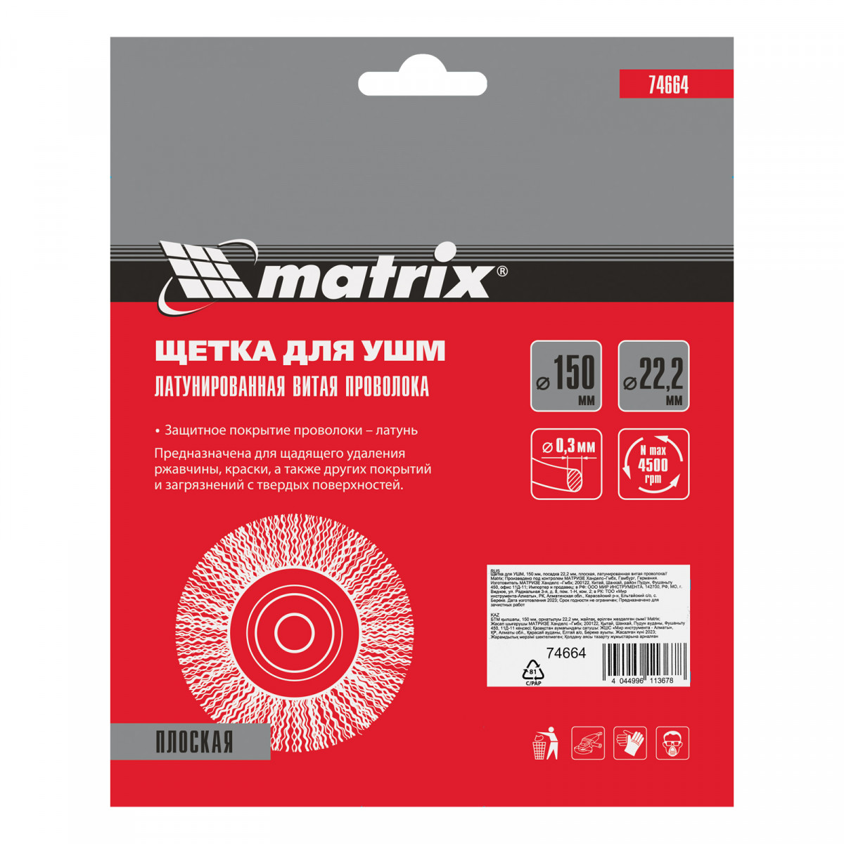 Плоская щетка для УШМ Matrix 74664 диаметром 150 мм, с щетиной из латунированной витой проволоки, посадкой 22,2 мм, предназначена для щадящей обработки поверхностей. Устанавливается на вал УШМ, поддерживающей скорость вращения не более 4500 об/мин. За счет плоской формы эффективно удаляет загрязнения, ржавчину и лакокрасочные покрытия в труднодоступных местах: углах и изгибах.