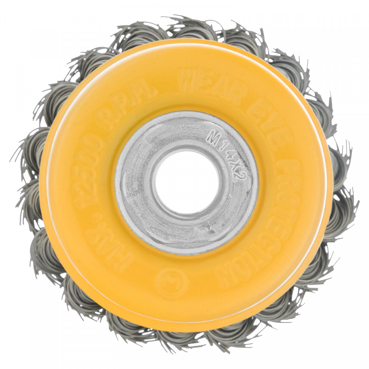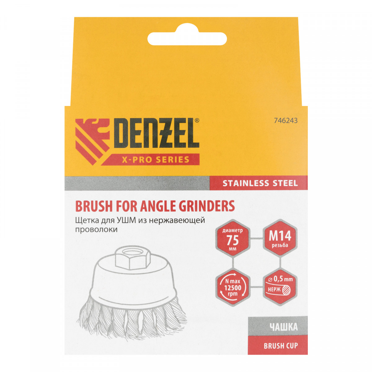 Щетка для УШМ «Чашка» Denzel 746243, М14, диаметром 75 мм, с щетиной из крученой нержавеющей проволоки диаметром 0,5 мм, предназначена для грубой очистки твердых поверхностей от ржавчины, лакокрасочных покрытий, загрязнений, удаления заусенцев, а также для зачистки сварных швов. Снимает толстый слой материала, идеально подходит для обработки изделий из нержавеющей стали. Щетка имеет форму чашки и позволяет очищать участки большой площади. Оснастку устанавливают на вал углошлифовальной машины. Рекомендуемая максимальная скорость вращения составляет 12500 об/мин. Во время работы следует использовать средства индивидуальной защиты — очки, респиратор, наушники, перчатки, а также специальную одежду и обувь. Щетка применяется в строительстве, на производстве, а также в быту.