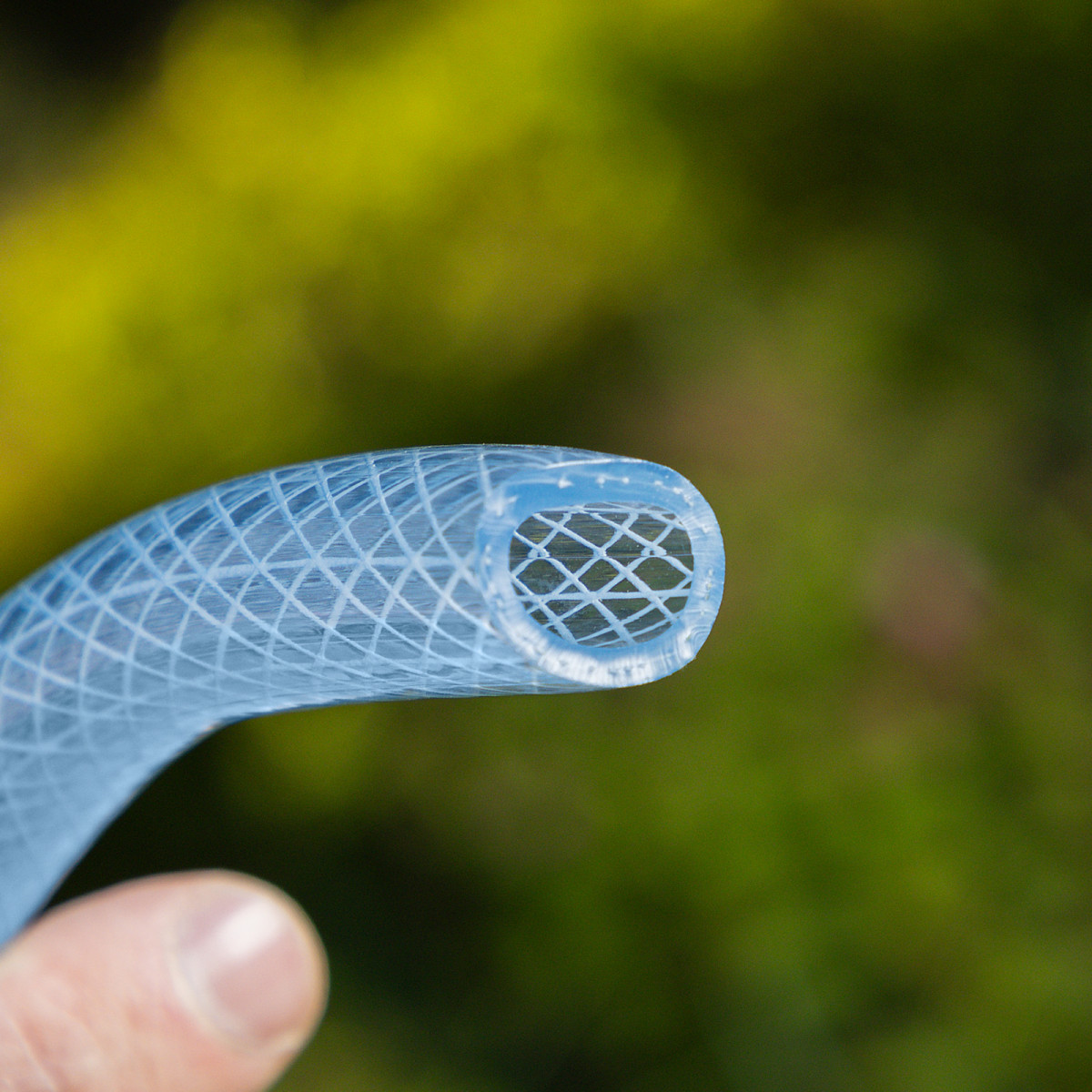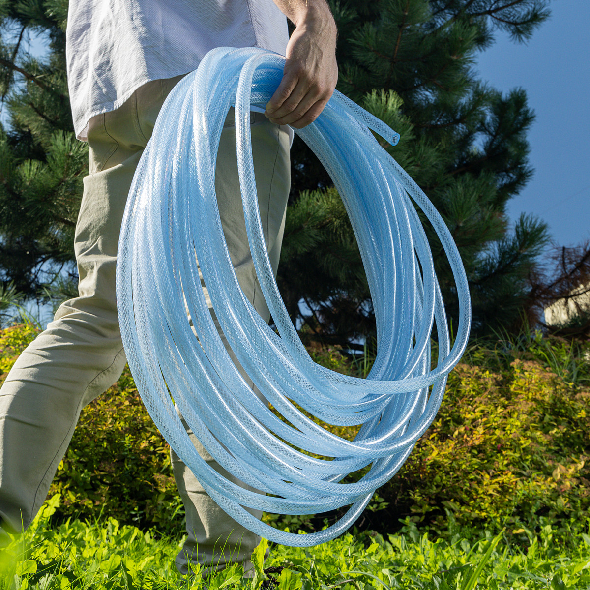 - Повышенная прочность — шланг изготовлен из поливинилхлорида (ПВХ) и армирован нитью из полиэстера.