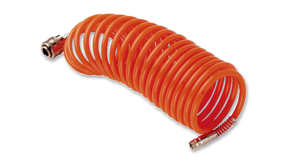 Шланг спиральный служит удлинителем между компрессором и рабочим инструментом. Изготовлен из нейлона. Достаточная длина оснастки позволяет осуществлять работы на нужном расстоянии от компрессора. Шланг оснащен фитингами рапид.