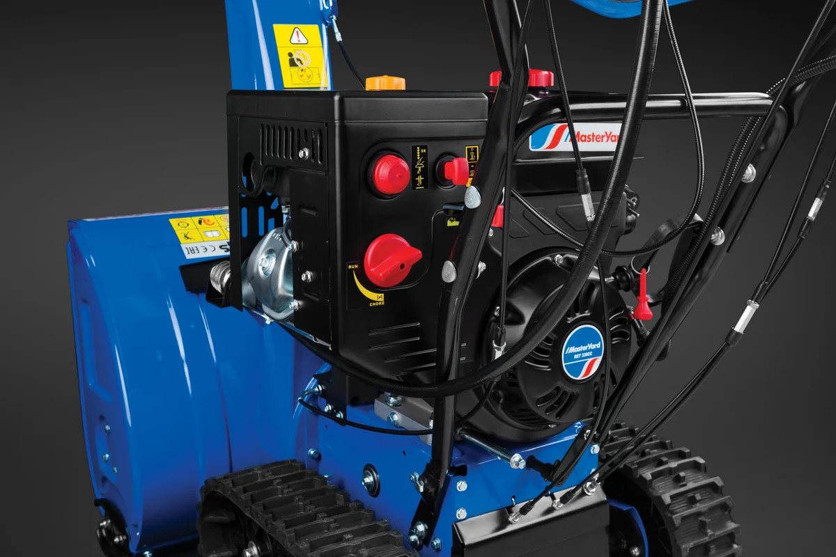 Снегоуборщик MasterYard MV 23528 RET - это бензиновая самоходная гусеничная модель. Машина оснащена электростартером, двойной яркой фарой, системой быстрого разворота желоба выброса и обогревом рукояток