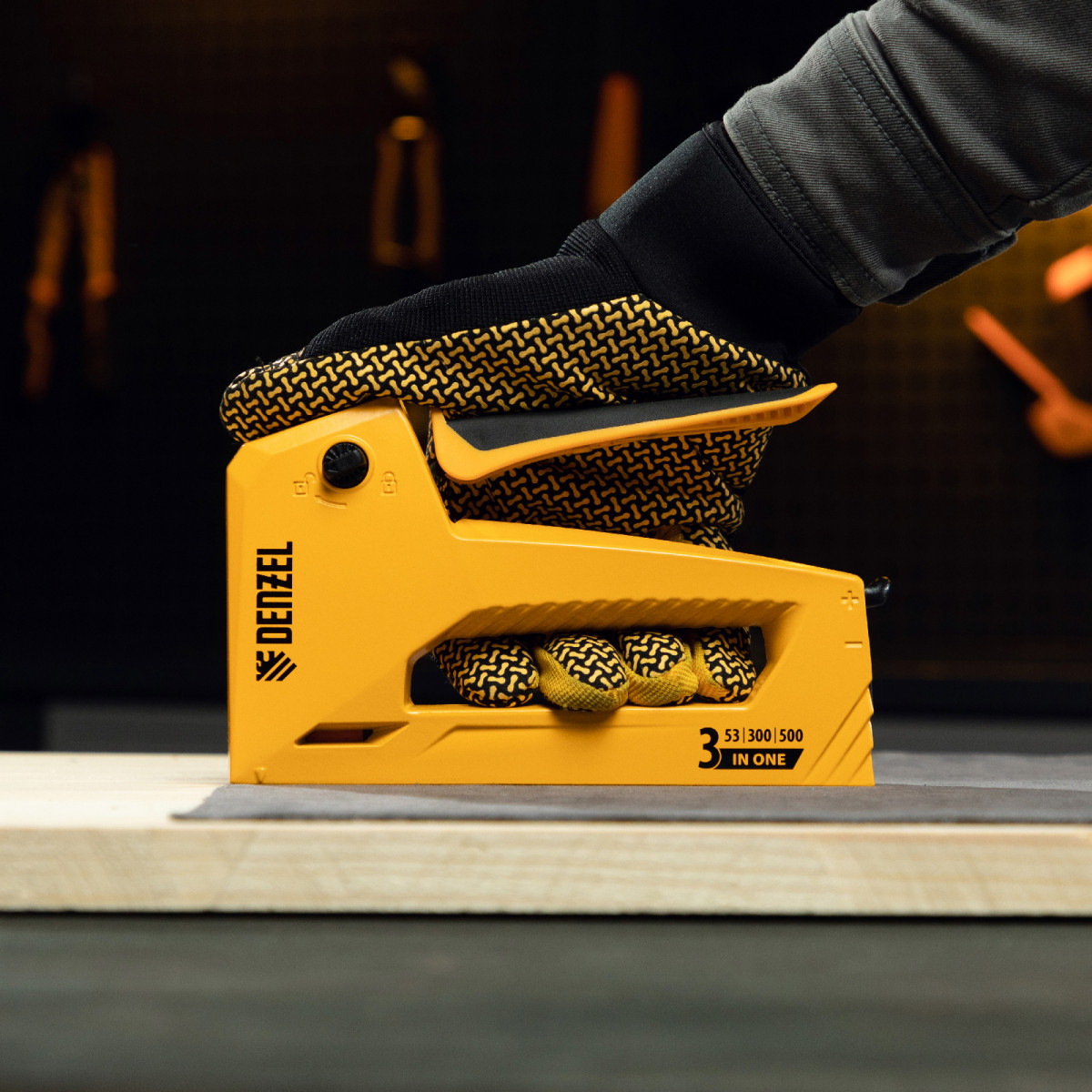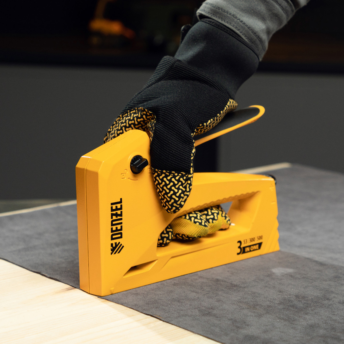 Мебельный степлер Denzel 40214 в алюминиевом корпусе работает со скобами типа 53 размером 6-14 мм, а также гвоздями 300 и штифтами 500 длиной 15 мм. Используется для скрепления листовых материалов: фанеры, ДВП, ДСП, оргалита, а также для фиксации пленки и теплоизоляционного материала на деревянном основании. Эффективный ударный механизм позволяет на 30% снизить нагрузку на руку. Инструмент пригодится для обивки мебели, укладки напольных покрытий, выполнения ремонтных и багетных работ.