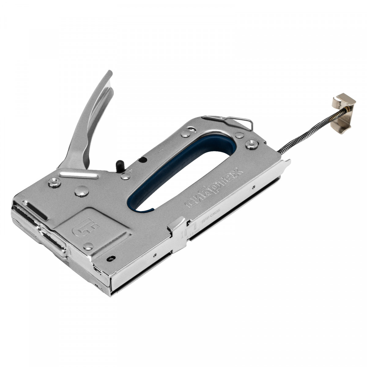 - Безопасное хранение и транспортировка — скоба-фиксатор удерживает рукоятку в нерабочем положении, исключая случайное срабатывание степлера.