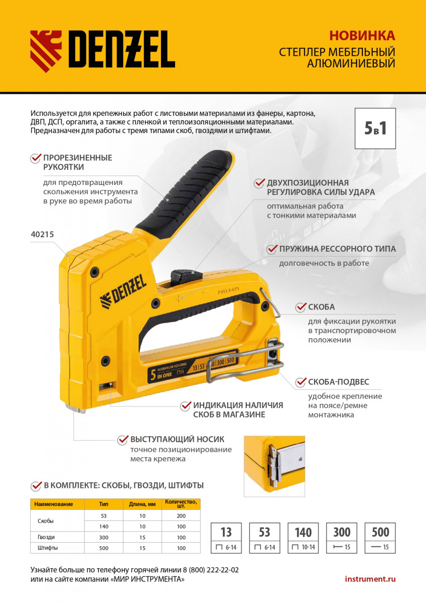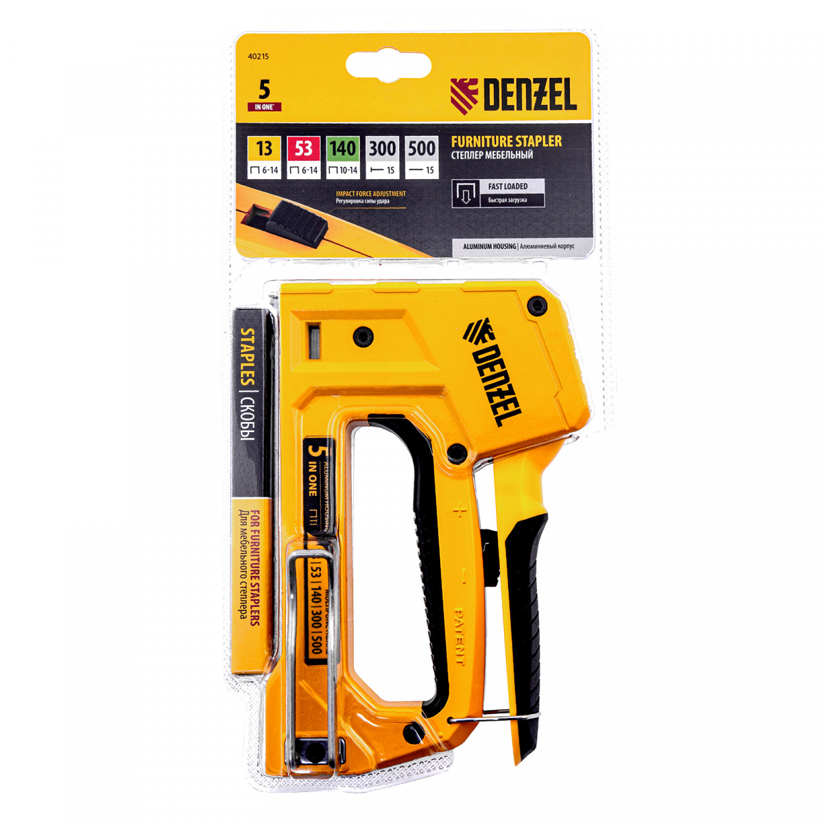 Степлер мебельный, тип 53 и 13, 6-14мм, тип 140, 10-14мм, тип 300, 15мм, тип 500, 15мм Denzel
