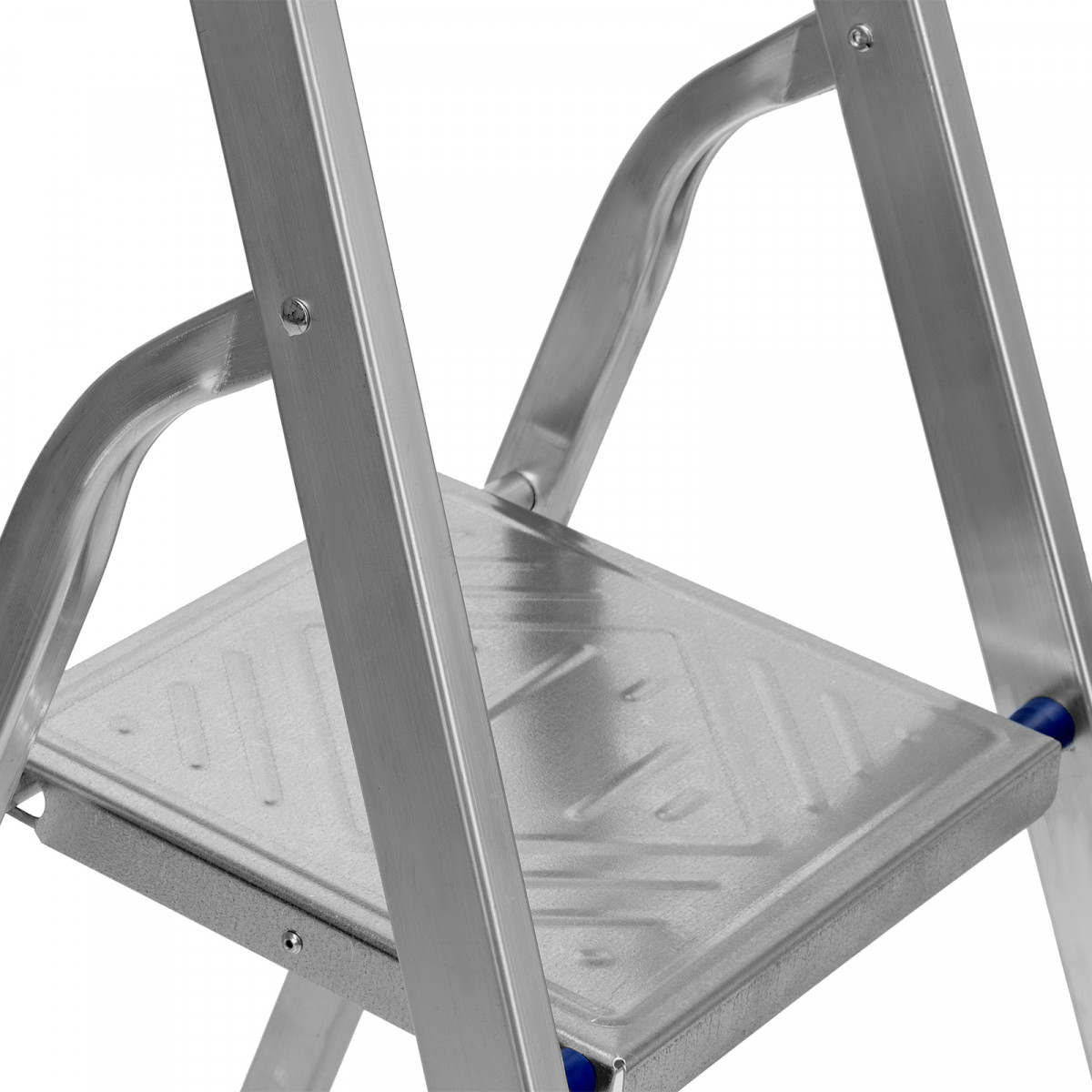- Надежность — рама из прямоугольного алюминиевого профиля выдерживает нагрузку до 150 кг, широкие ступени закреплены заклепками.