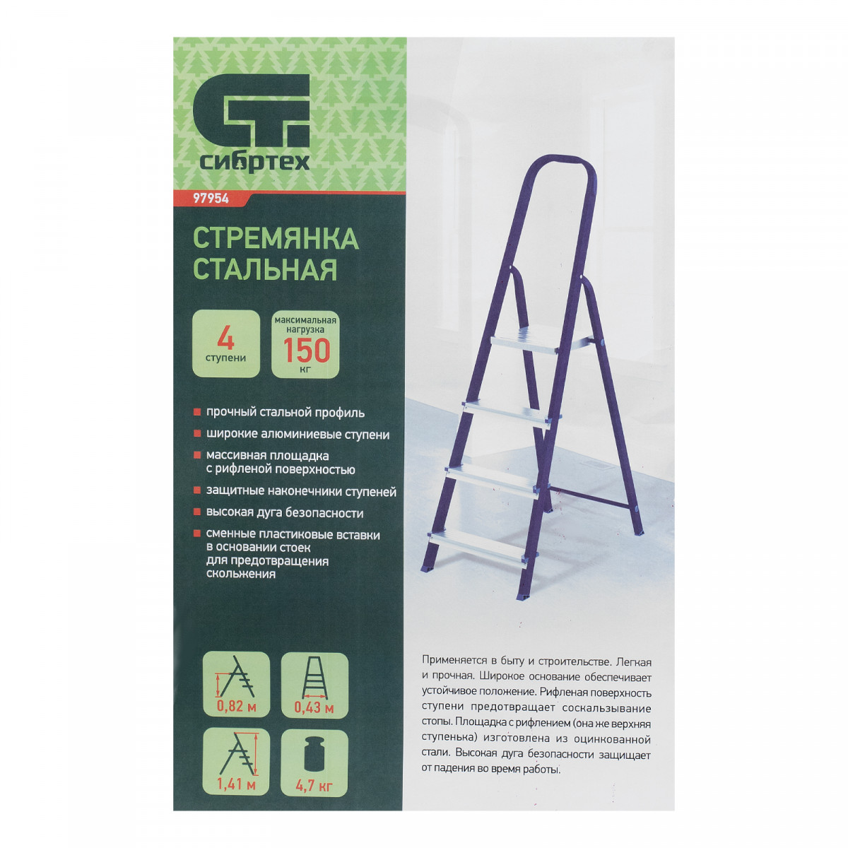 Стремянка Сибртех обладает высокой прочностью и выдерживает нагрузку до 150 кг.