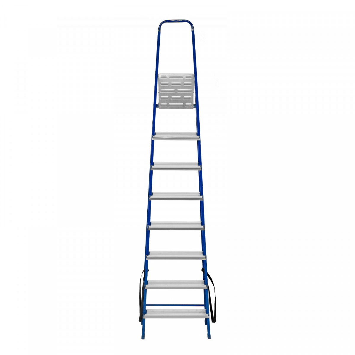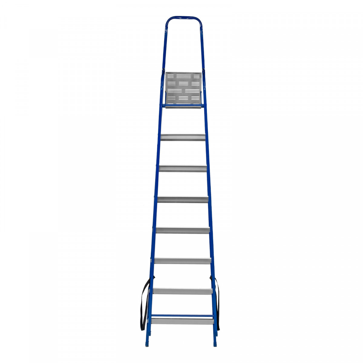 - Надежность — рама изготовлена из профилированной стали, стальная верхняя площадка с зацепами прочно фиксирует стремянку в рабочем положении, страховочные ленты придают дополнительную прочность конструкции.