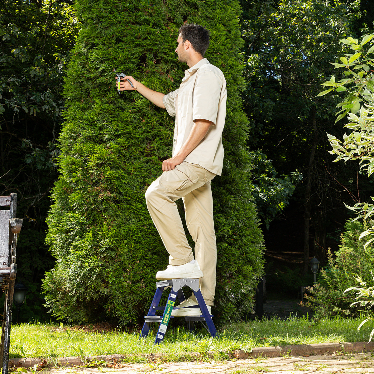 Во время работы следует соблюдать технику безопасности — устанавливать стремянку на ровную поверхность и не пользоваться электроинструментом.