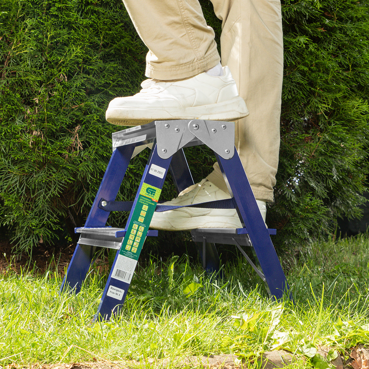 - Пластиковые заглушки на опорах — стремянка не скользит и не царапает напольное покрытие.