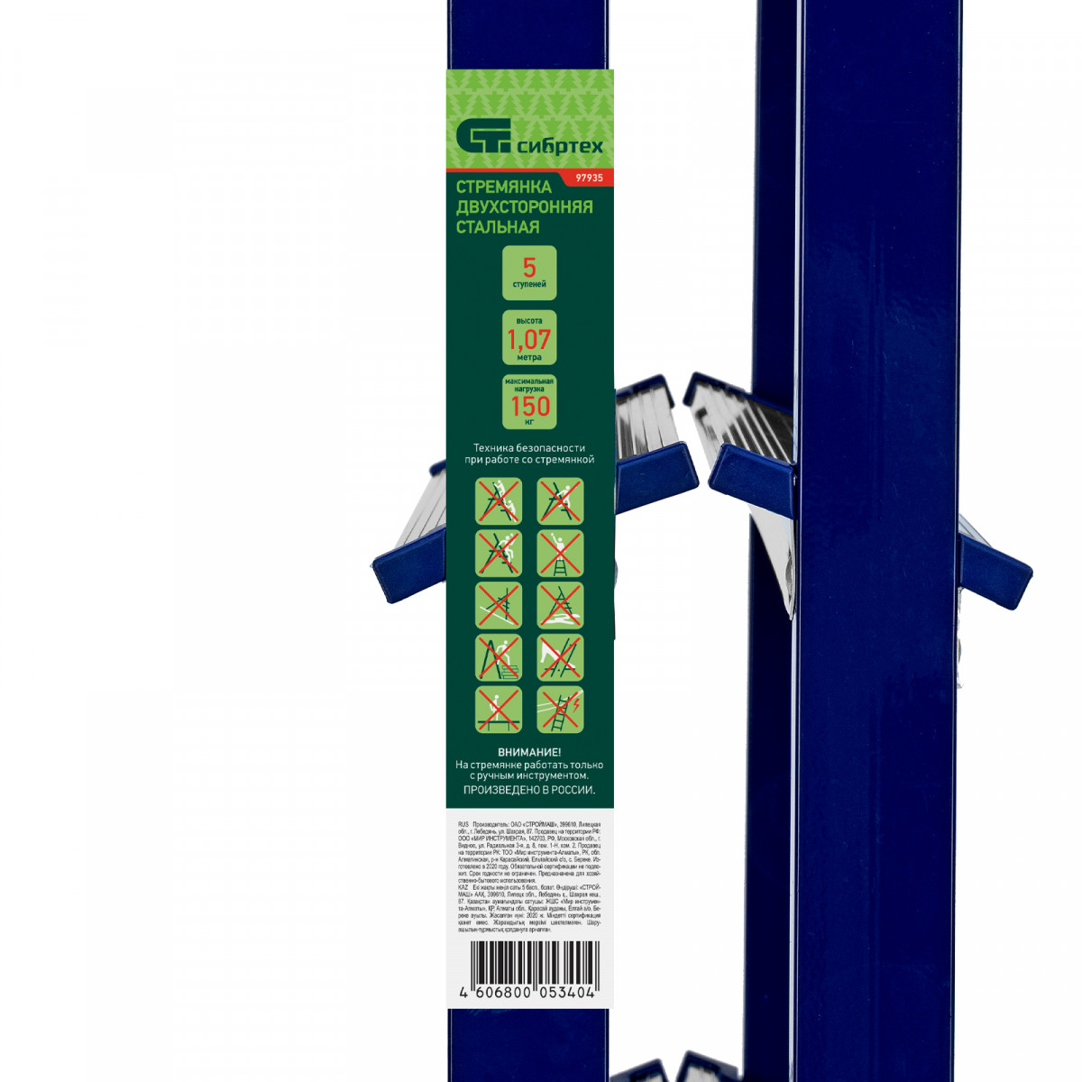 Стремянка двусторонняя стальная Сибртех 97935 с 5 ступенями используется строителями, работниками коммунальных служб, а также полезна в быту. Незаменима, если нужно выполнить монтажные или отделочные работы на высоте, провести уборку, а также достать нужные предметы с антресолей или верхней полки шкафа. На широких ступенях комфортно стоять. Площадка находится на высоте 100,4 см от опорной поверхности, рабочая высота стремянки составляет 300,4 см (при среднем росте пользователя 170 см). Стальная рама прямоугольного сечения выдерживает нагрузку до 150 кг.
