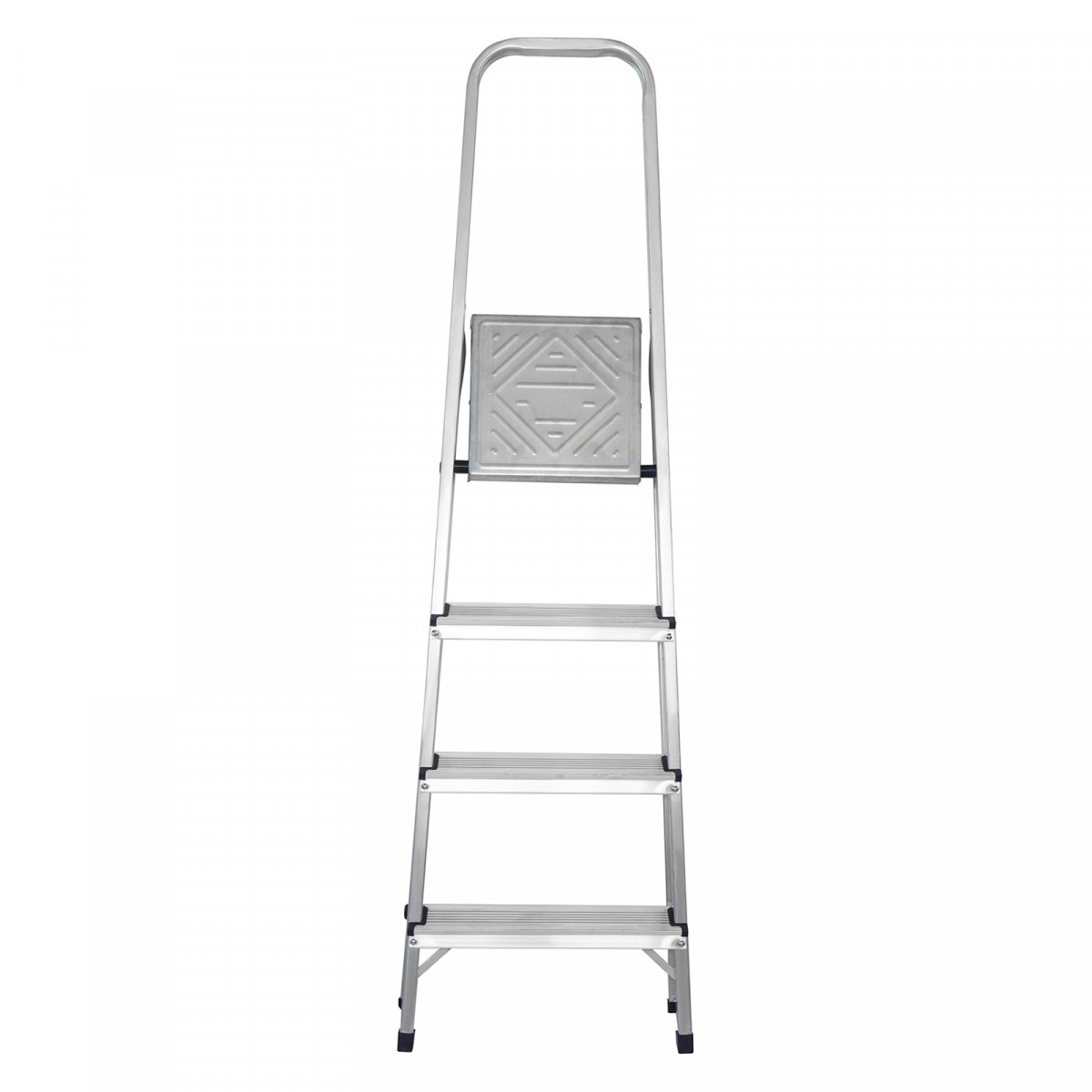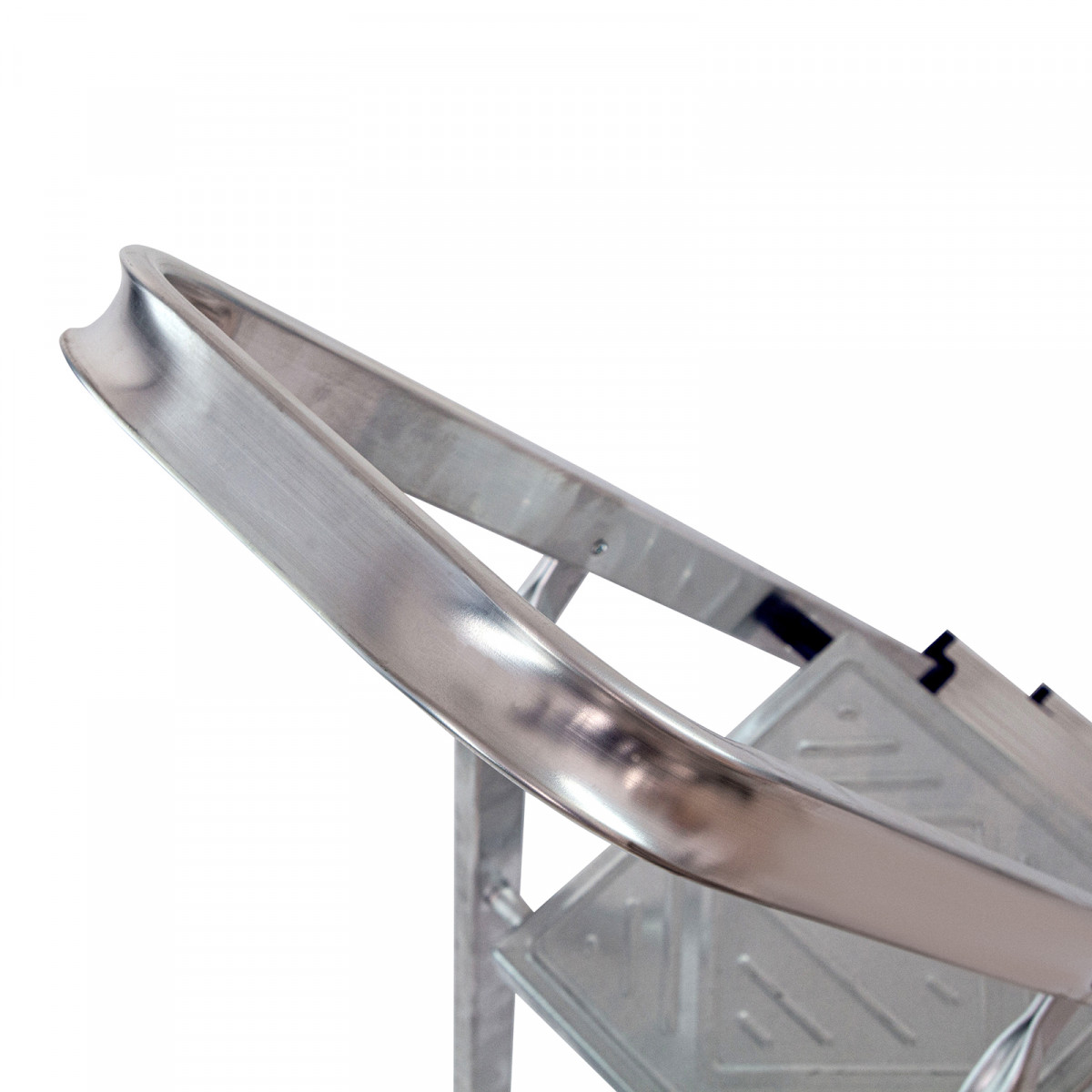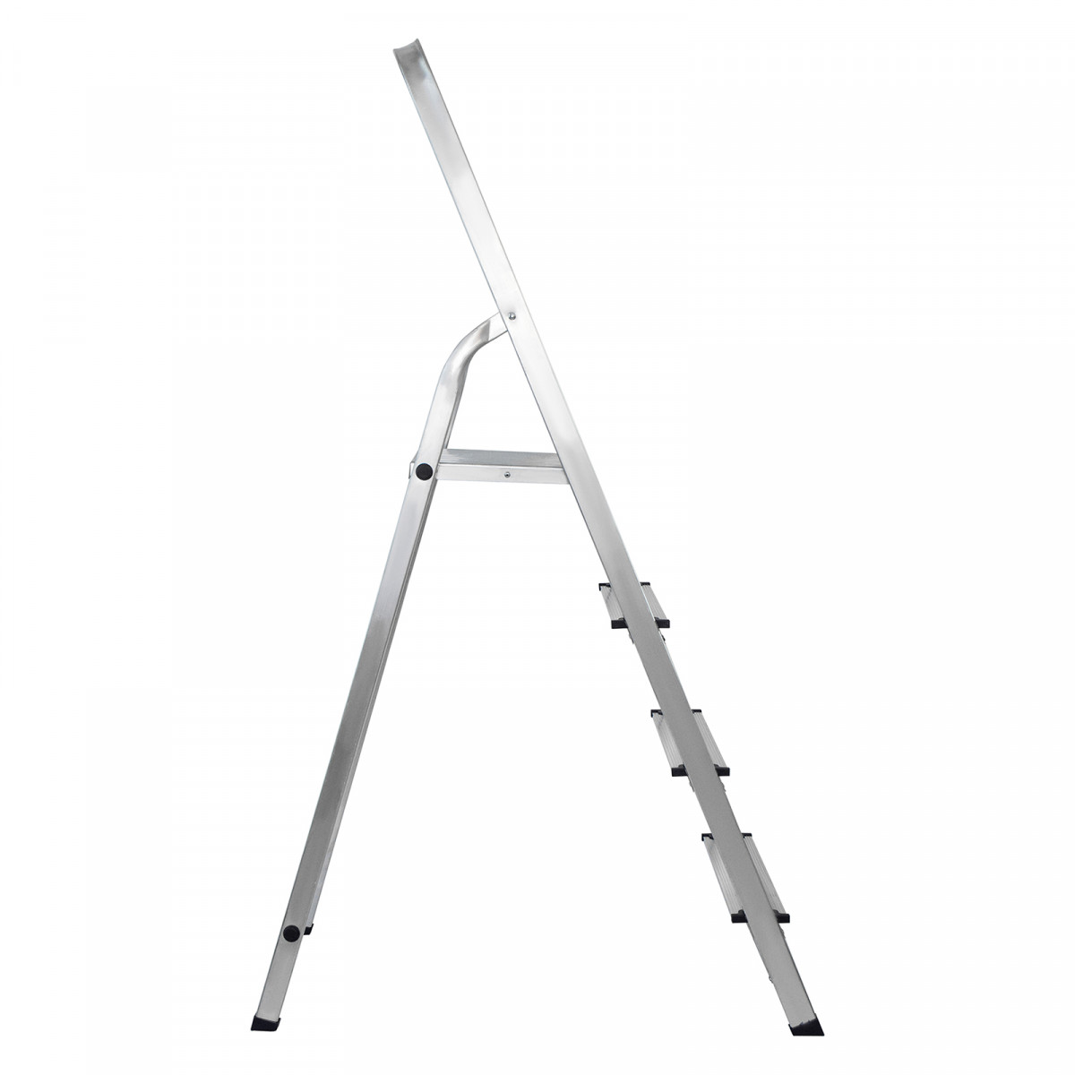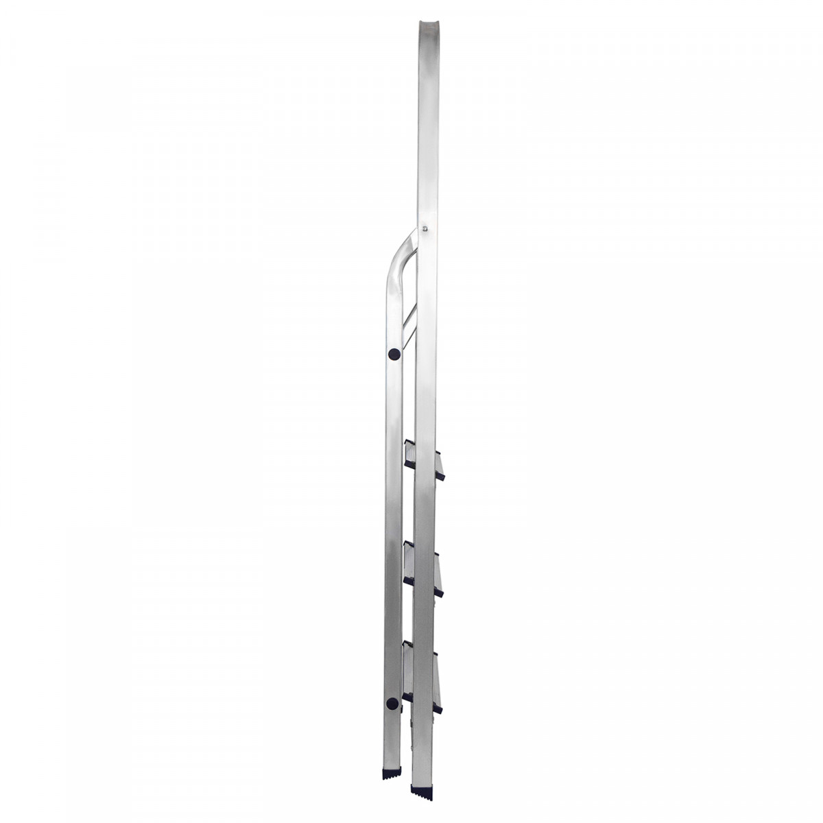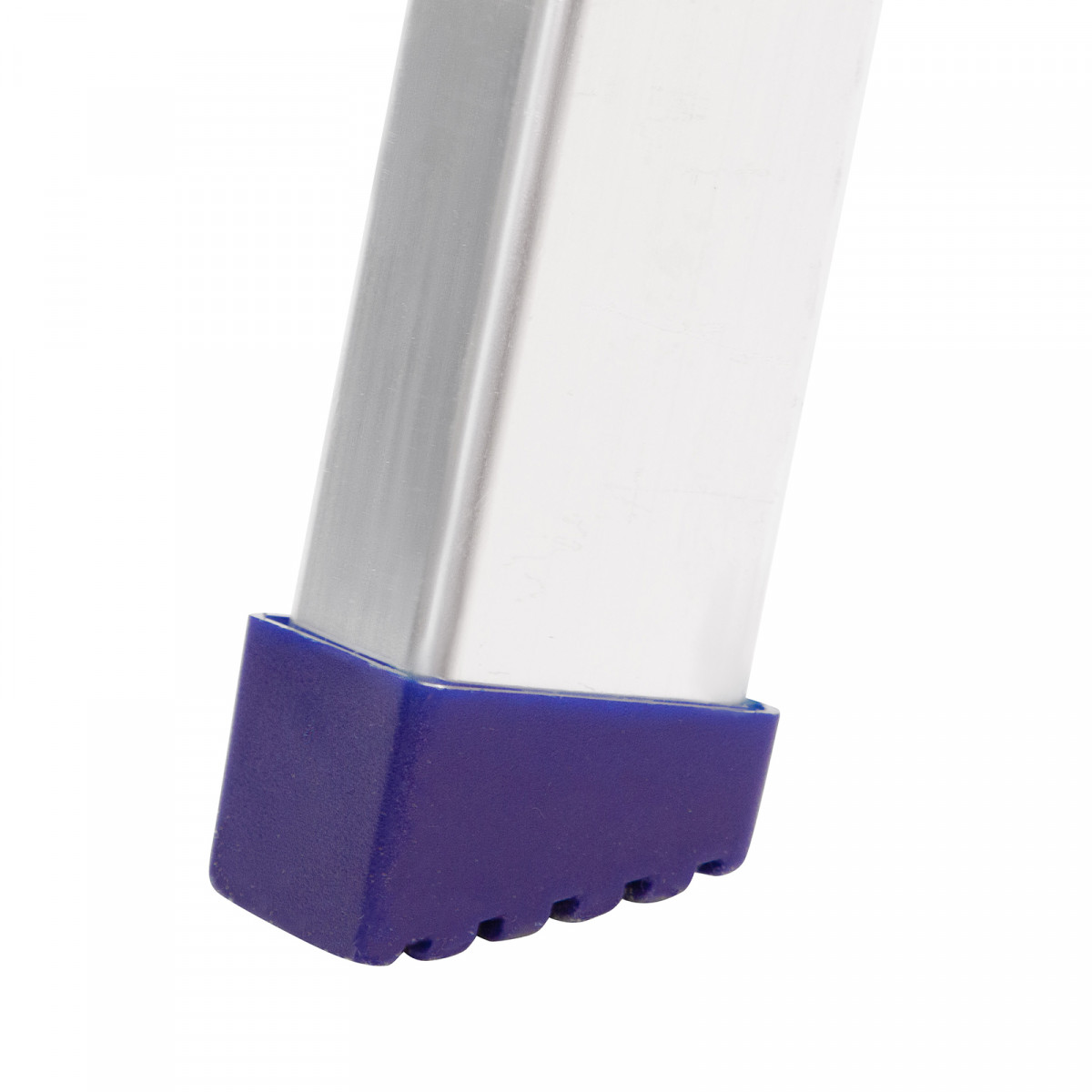 - Надежность — рама из прямоугольного алюминиевого профиля выдерживает нагрузку до 150 кг, широкие ступени закреплены заклепками.