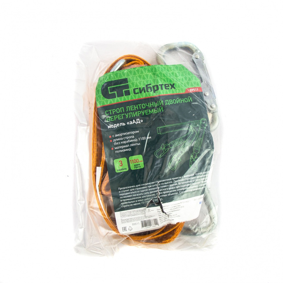 Ленточный двойной строп Сибртех 89511 с амортизатором, нерегулируемая модель «аАД», предназначен для соединения удерживающей (страховочной) привязи с анкерной точкой крепления. Используется совместно с удерживающими (страховочными) привязями, имеет 3 карабина, которые обеспечивают 3 точки крепления: 2 к анкерной точке и одну к поясу работника.