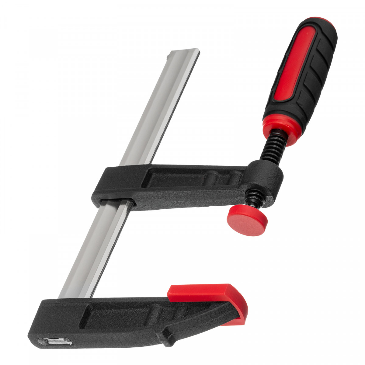 Усиленная F-образная струбцина Matrix 20400 размером 150 х 80 х 230 мм используется для зажима металлических, деревянных и других заготовок для их последующей обработки или сборки. Представляет собой штангу, на которой установлены 2 кронштейна — неподвижный и подвижный. Деталь помещается между ними и прижимается к губкам при помощи винтового зажима с трапециевидной резьбой. Величина захвата регулируется при помощи подвижного кронштейна и может достигать 150 мм. Струбцину используют для проведения слесарных и столярных работ. Металлическая конструкция выдерживает высокую температуру, поэтому инструмент пригодится для выполнения сварочных работ (перед началом необходимо снять пластиковые накладки с губок).