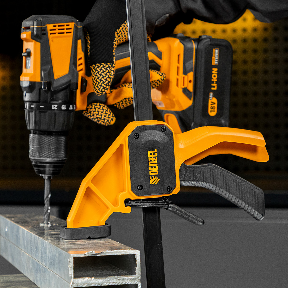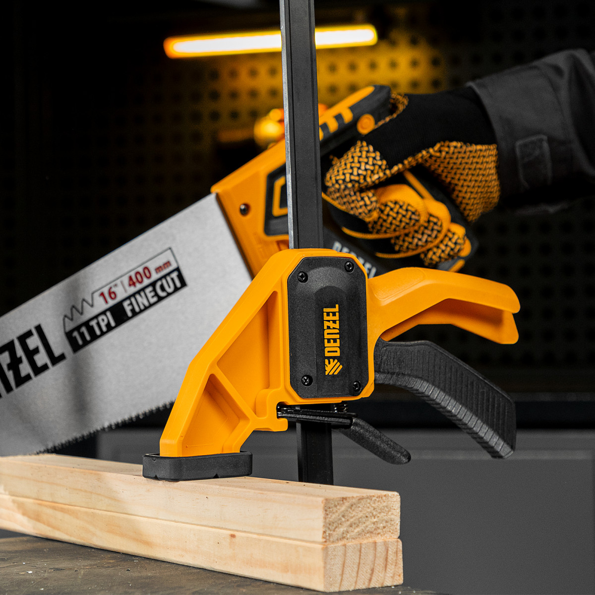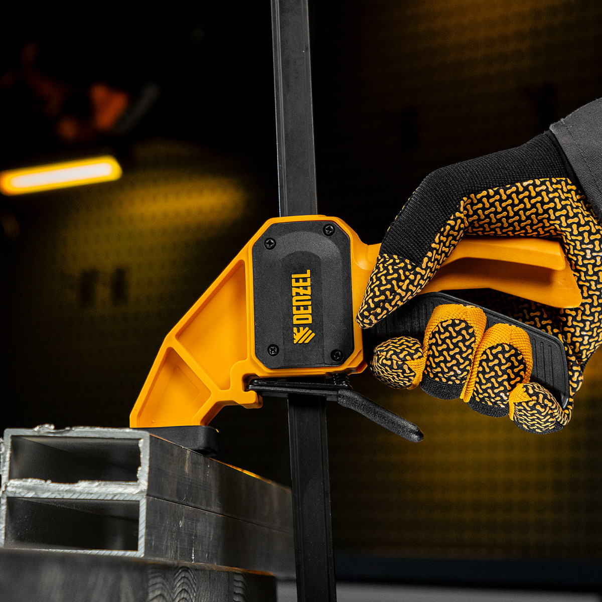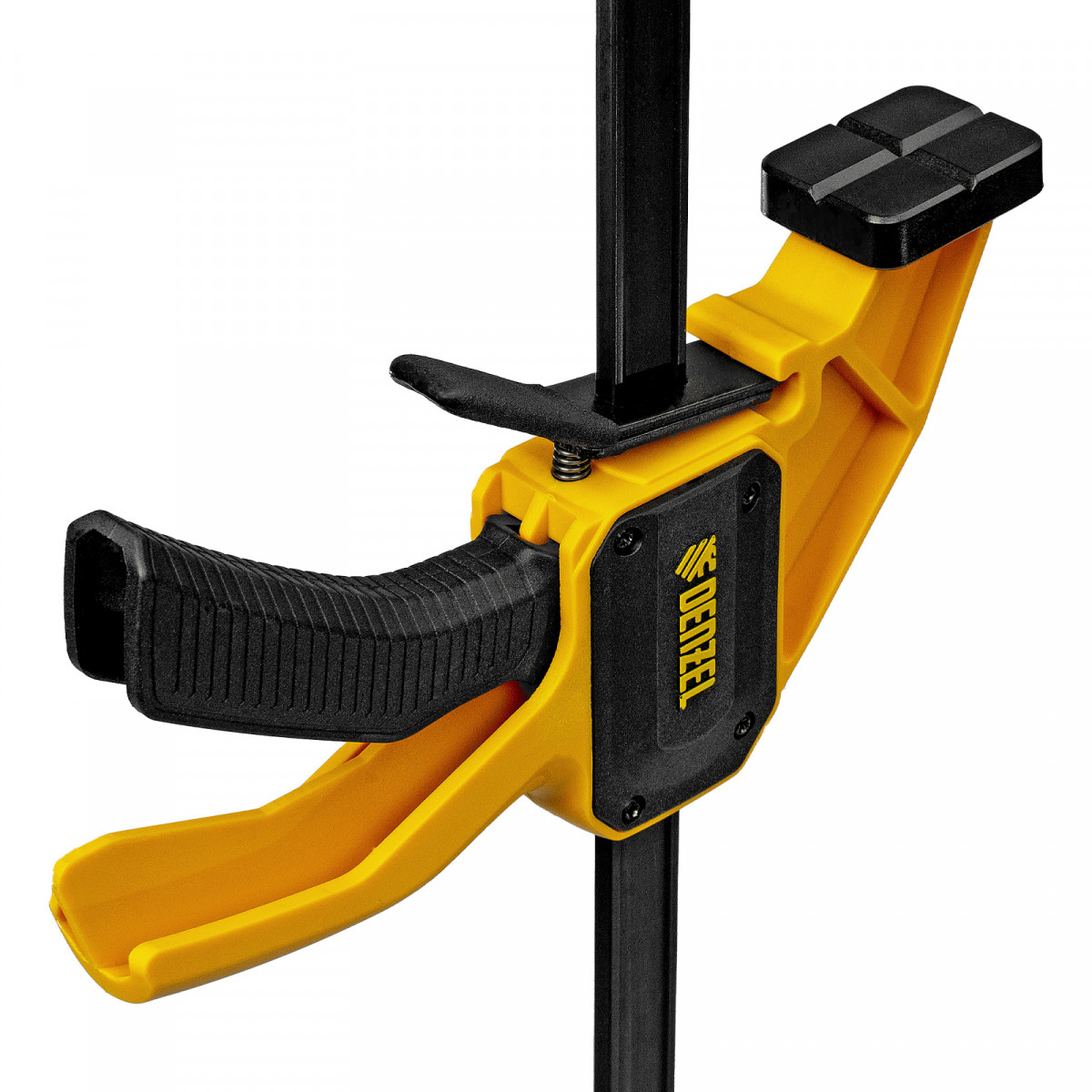 • Комфортное использование — струбцина весит всего 620 г, обрезиненная кнопка фиксации обеспечивает удобный захват.