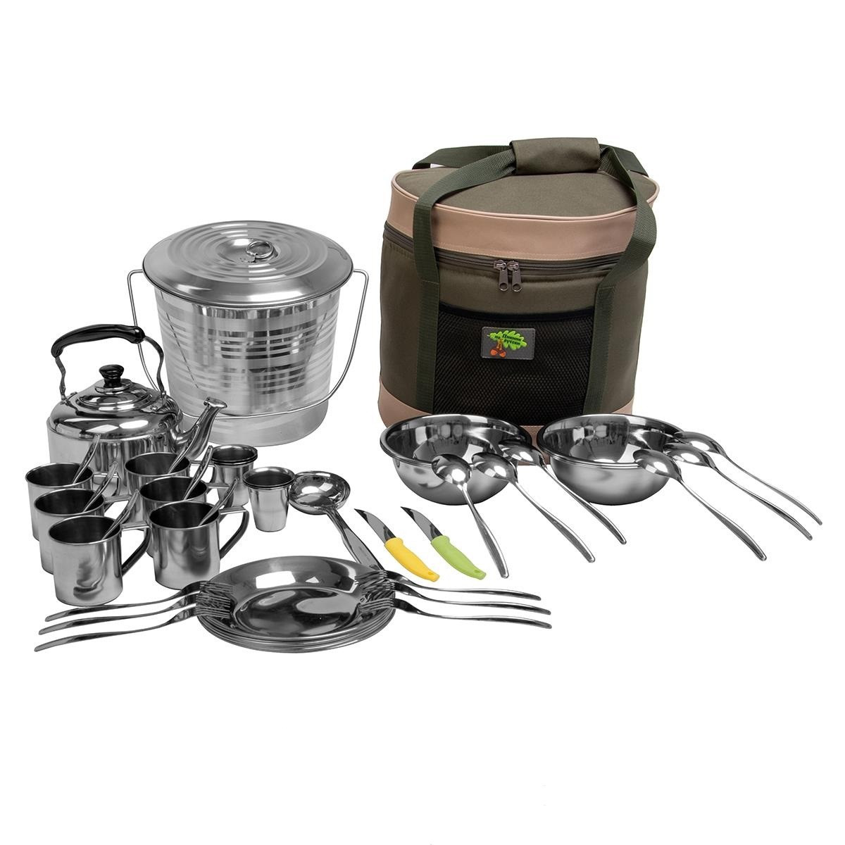 Для организации отдыха на природе компании до шести человек, помимо всего прочего, потребуется также довольно много посуды. У каждого участника пикника или похода должна быть миска, вилка, столовая и чайная ложки, стопка для крепкого алкоголя и кружка для остальных напитков и воды — и это только самый минимум. Прибавляем сюда также нож, ведро и половник, и хотя эти предметы будет достаточно взять в одном экземпляре, а не шести, но даже с учетом данного факта получается довольно много всего. В предлагаемую нами сумку компактно упакован посудный набор, включающий в себя всё вышеперечисленное. Все емкости и столовые приборы сделаны из нержавеющей стали, поэтому они мало весят, а еще выгодно отличаются от пластиковых аналогов прочностью и долговечностью. КОМПЛЕКТАЦИЯ • Кружка 0,45 мл. – 6 шт • Стопка 0,1 мл. – 6 шт, • Миска глубокая – 6 шт • Тарелка – 6 шт • Вилка – 6 шт, • Ложка столовая – 6 шт • Ложка чайная – 6 шт, • Нож – 1 шт • Ведро с крышкой 12 л. – 1 шт • Половник – 1 шт • Чайник 2,2 л – 1 шт.