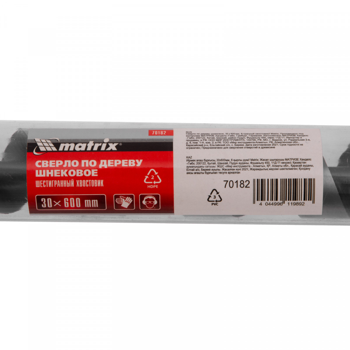 Сверло по дереву шнековое, 30 х 600 мм, шестигранный хвостовик Matrix
