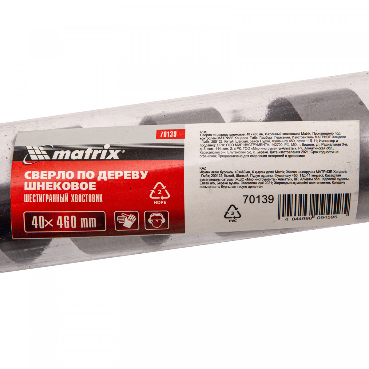 Сверло по дереву шнековое, 40 х 460 мм, шестигранный хвостовик Matrix