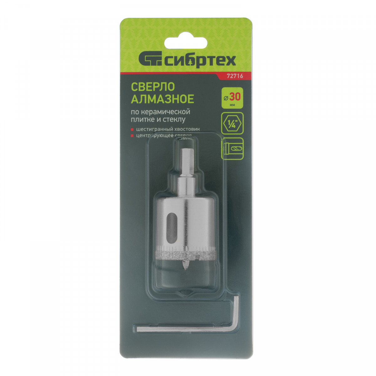 Сверло по керамической плитке и стеклу, 30 х 55 мм, шестигранный хвостовик, с центрующим сверлом Сибртех