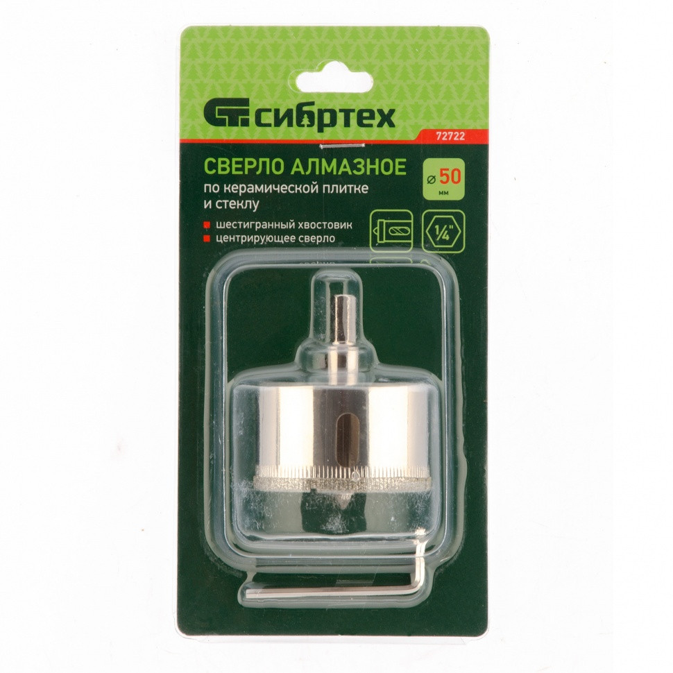 Сверло Сибртех 72722 размером 50 х 55 м, с шестигранным хвостовиком и центрирующим сверлом, позволяет получать отверстия в керамической плитке и стекле. Его устанавливают на дрель или шуруповерт, рекомендуемый диапазон рабочих оборотов 350-700 об/мин. Оснастка используется при выполнении бытовых ремонтных и отделочных работ.