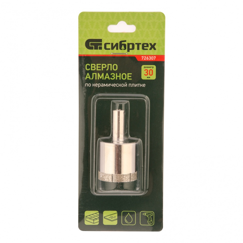 Сверло Сибртех 726307 размером 30 х 55 мм, с цилиндрическим хвостовиком, используется для получения ровных отверстий без сколов в стекле и керамической плитке. Устанавливается в патрон дрели или шуруповерта, работающих в диапазоне 350-700 об/мин. Во время работы рекомендуется применять водяное охлаждение — это существенно увеличит ресурс оснастки. Использование кондуктора (арт. 72830) позволяет точно позиционировать сверло и облегчает засверливание. Оснастка подходит для выполнения работ небольшого объема и рекомендована для использования в быту.
