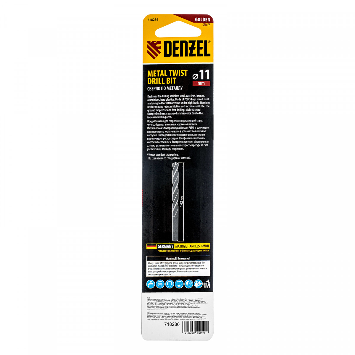 Сверло спиральное по металлу 11 x 142мм, Р6М5, Golden Tip, многогранная заточка Denzel