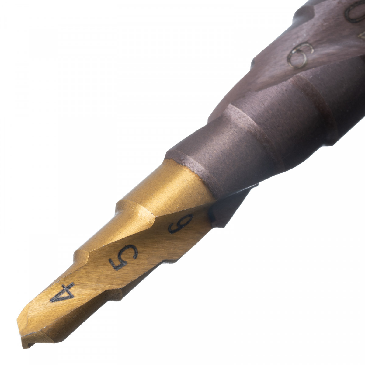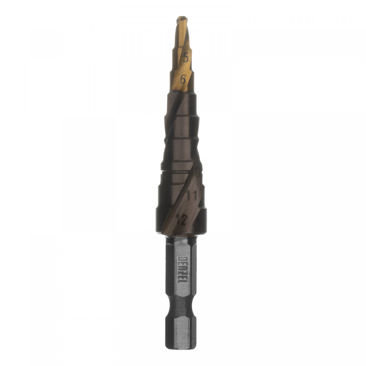 Сверло ступенчатое 4-5-6-7-8-9-10-11-12 мм, Р6М5К5, 6-гр. хвостовик Denzel