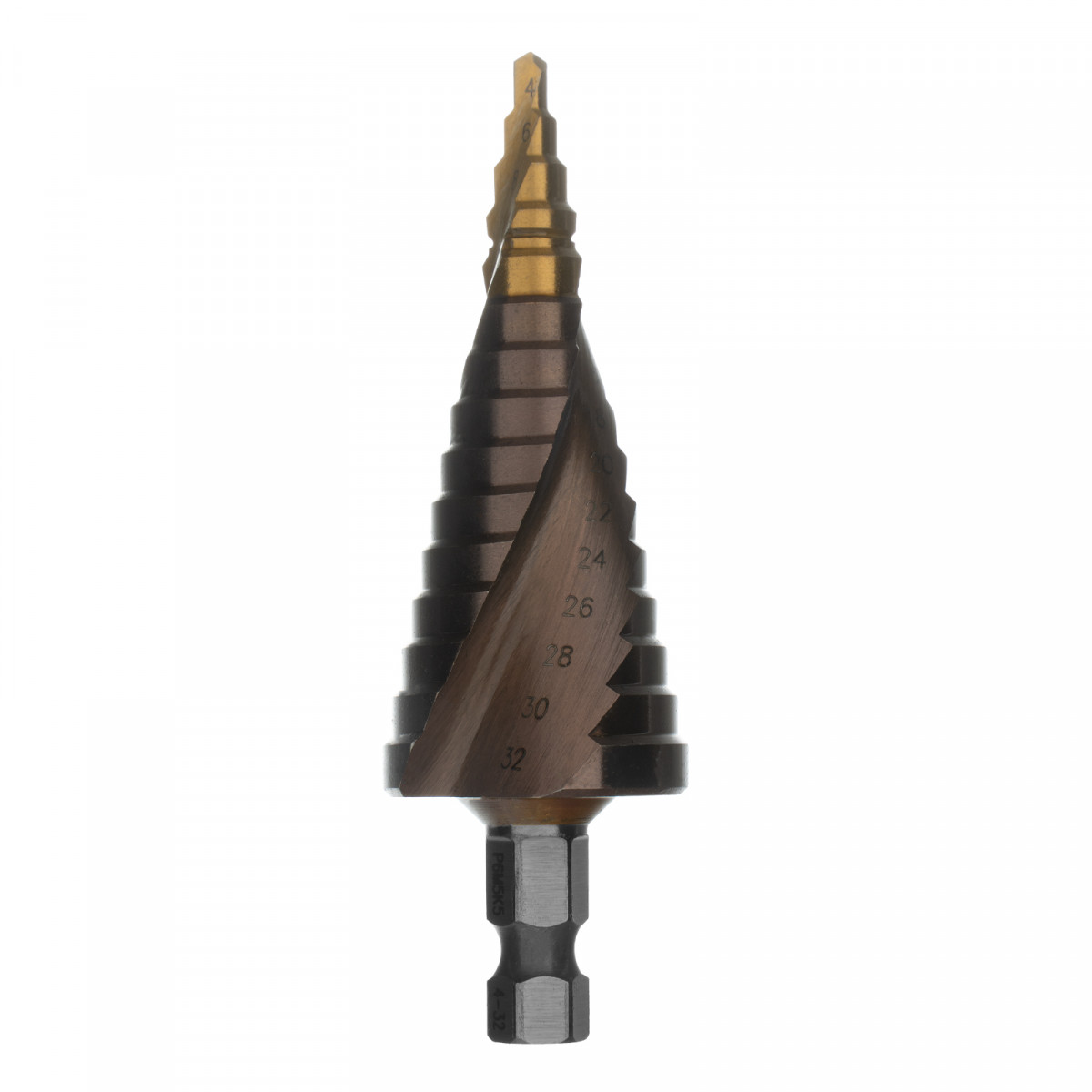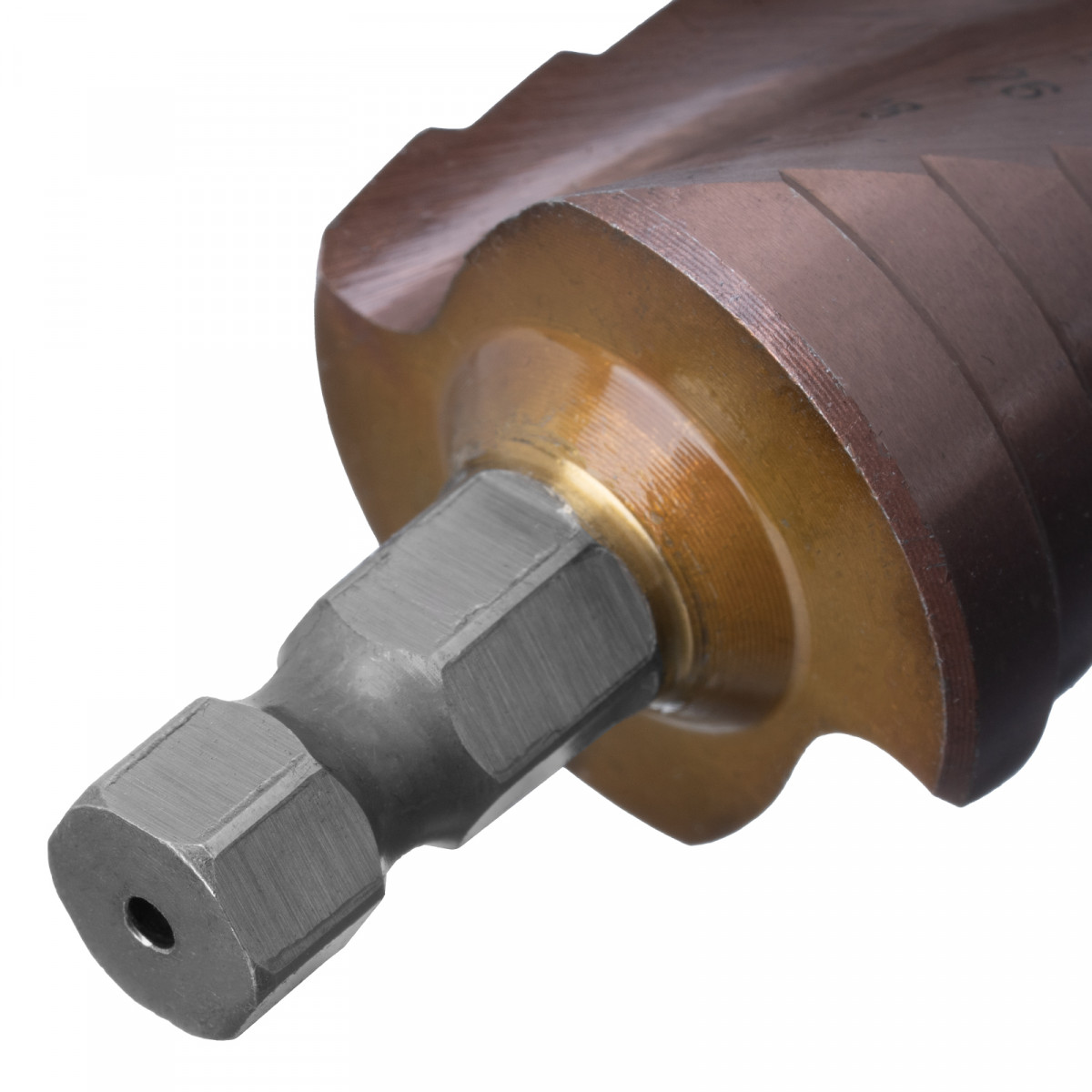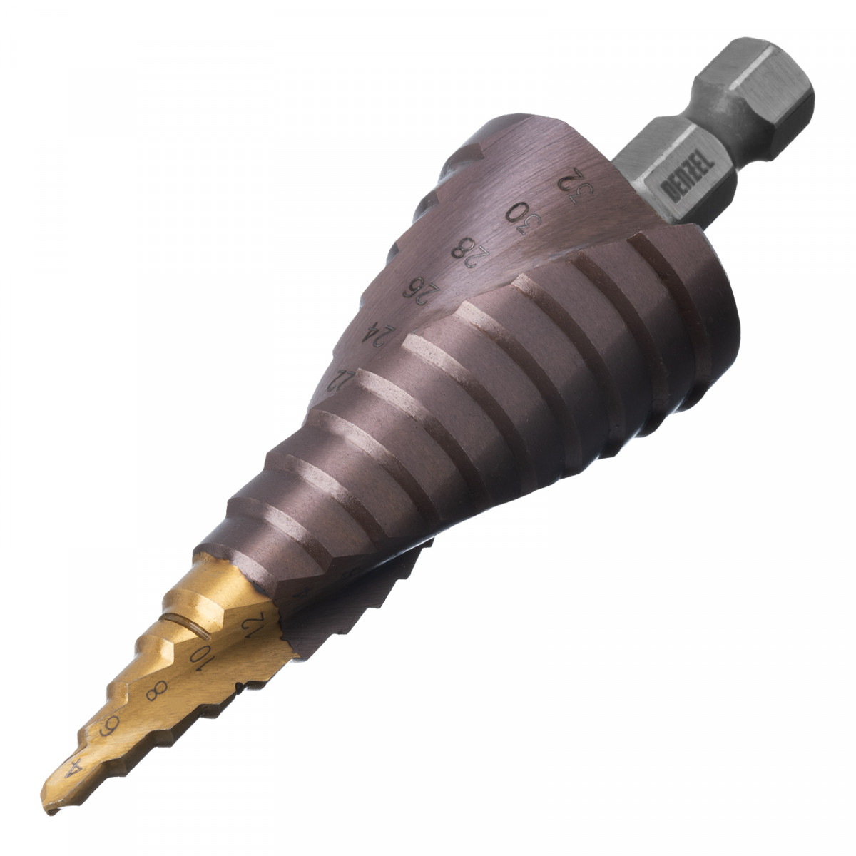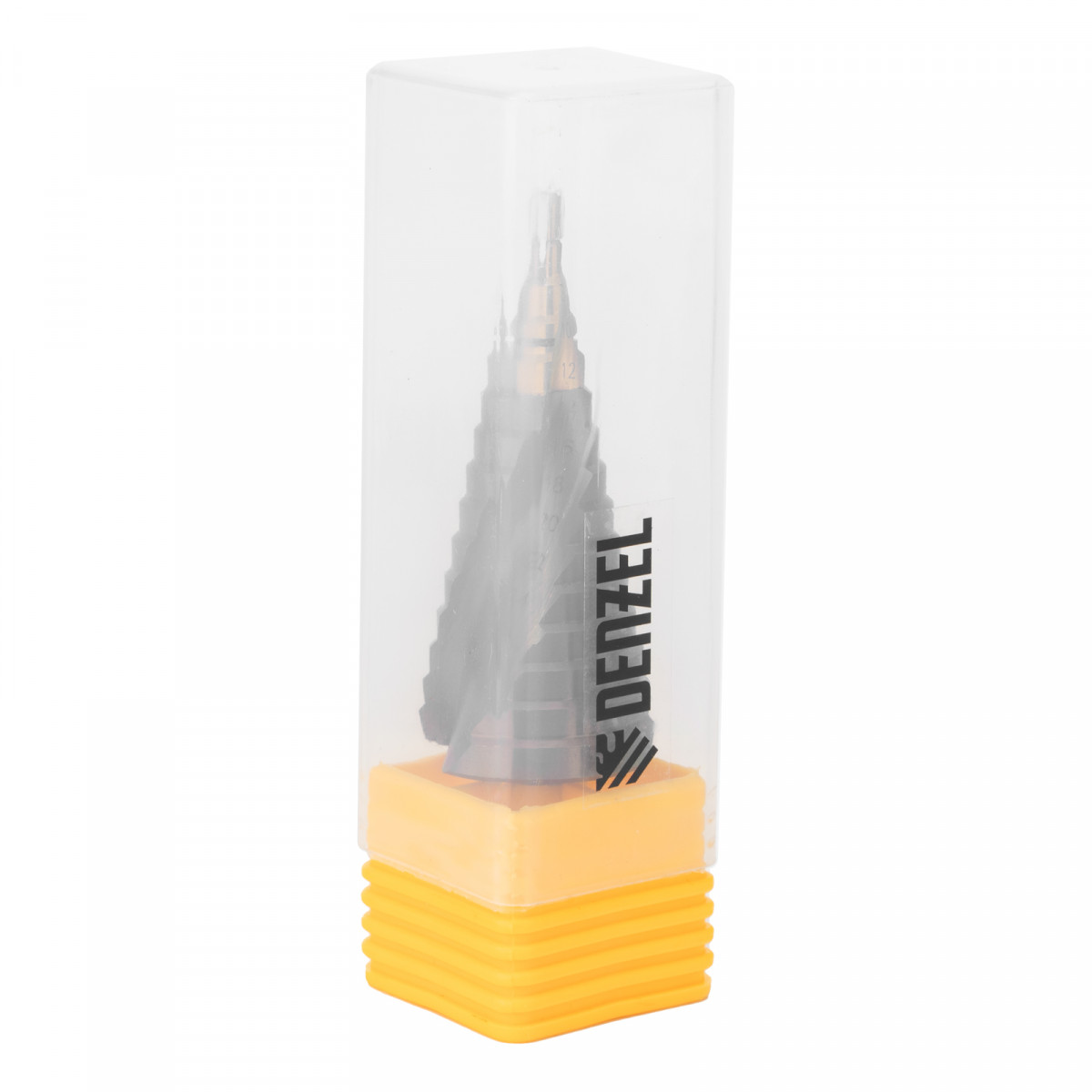 Сверло ступенчатое, 4-6-8-10-12-14-16-18-20-22-24-26-28-30-32 мм, Р6М5К5, 6-гр. хвостовик Denzel