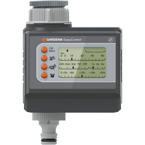 Таймер подачи воды EasyControl Gardena 01881-29.000.00 разработан для автоматического орошения садового участка, с целью рационального использования водных ресурсов, а также экономии времени пользователя. Таймер позволяет осуществлять запрограммированный полив в отсутствии владельцев участка, а также в утреннее и вечернее время, когда испарение воды минимально. Прибор удобен в эксплуатации, имеет 4 кнопки для выбора функций полива. Заданные параметры отображаются на большом и четком дисплее. Таймер предусматривает ежедневный полив (до 3-х раз в день), полив раз в 2 дня, раз в 3 дня, раз в неделю, а также выбор дней. Подключается к крану с резьбой 26.5 мм (G 3/4) и 33.3 мм (G1). Возможно подключение датчиков влажности или дождя.